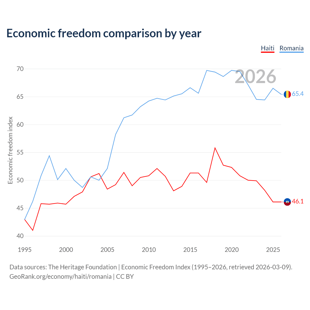 The Economic Freedom Index for Haiti is 46.1, ranking 178/197, compared to 65.4 for Romania, ranking 64/197. The chart above displays a comparison of annual changes in economic freedom indexes.