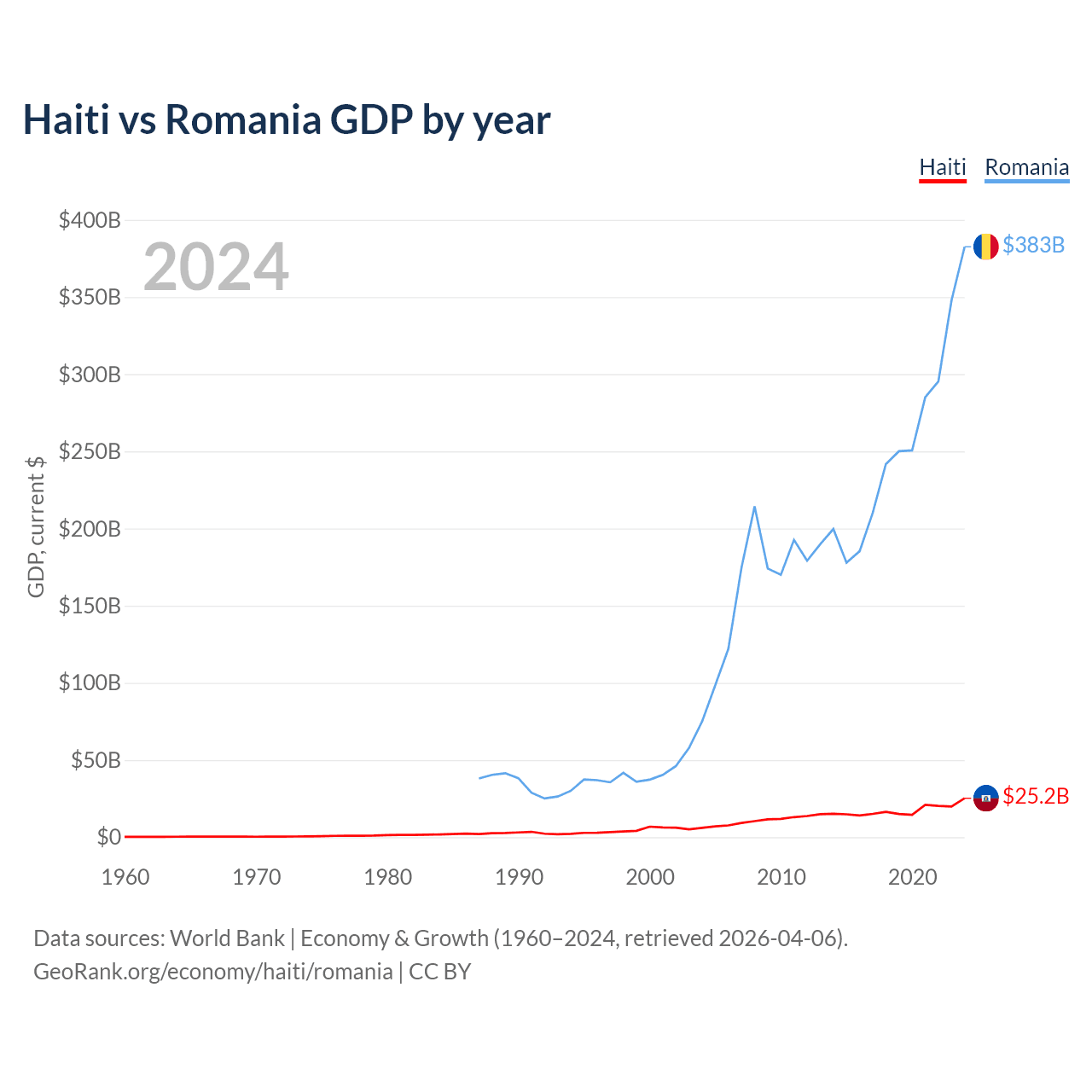 Haiti has a GDP of $25.2B compared to $383B for Romania, ranking 117/197 and 42/197 by economy size, respectively.