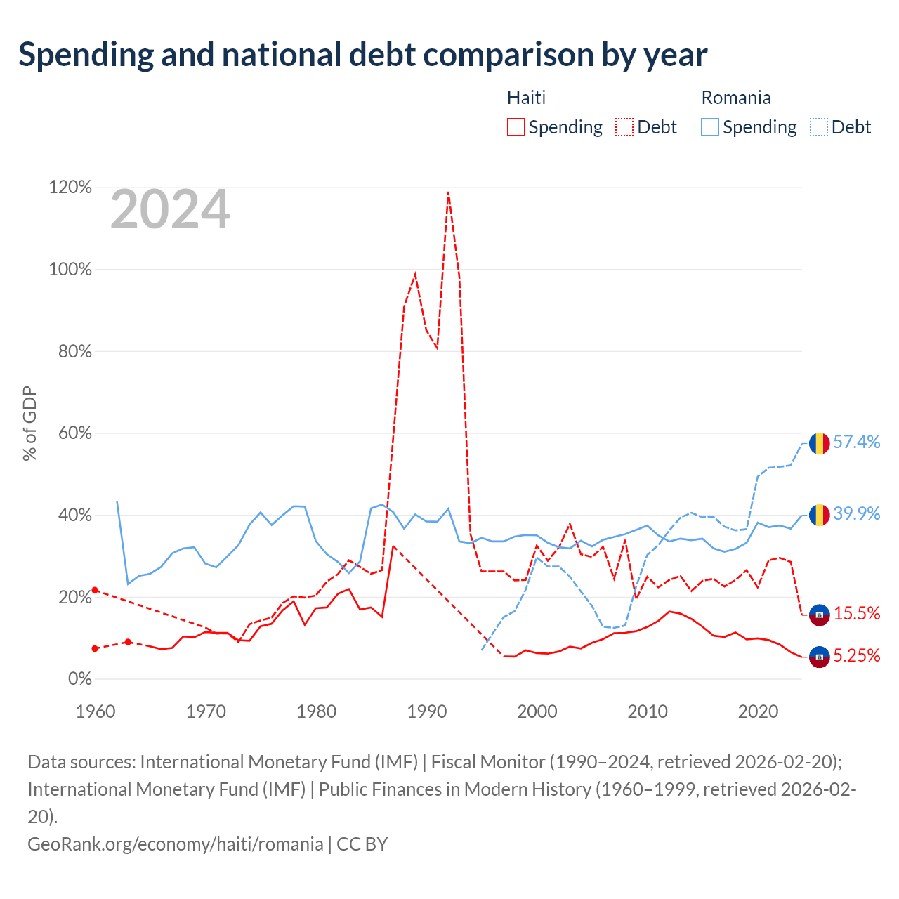 Haiti has $3.91B in government debt (15.5% of GDP), compared to $220B (57.4% of GDP) in Romania.