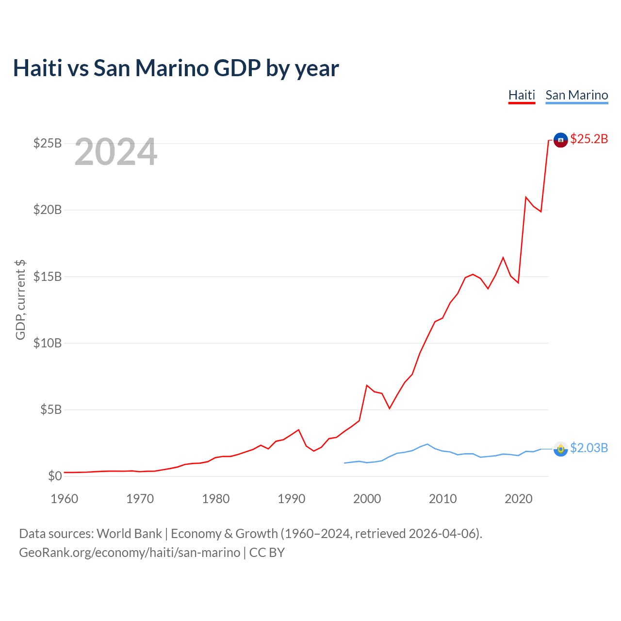 Haiti has a GDP of $25.2B compared to $2.03B for San Marino, ranking 117/197 and 180/197 by economy size, respectively.