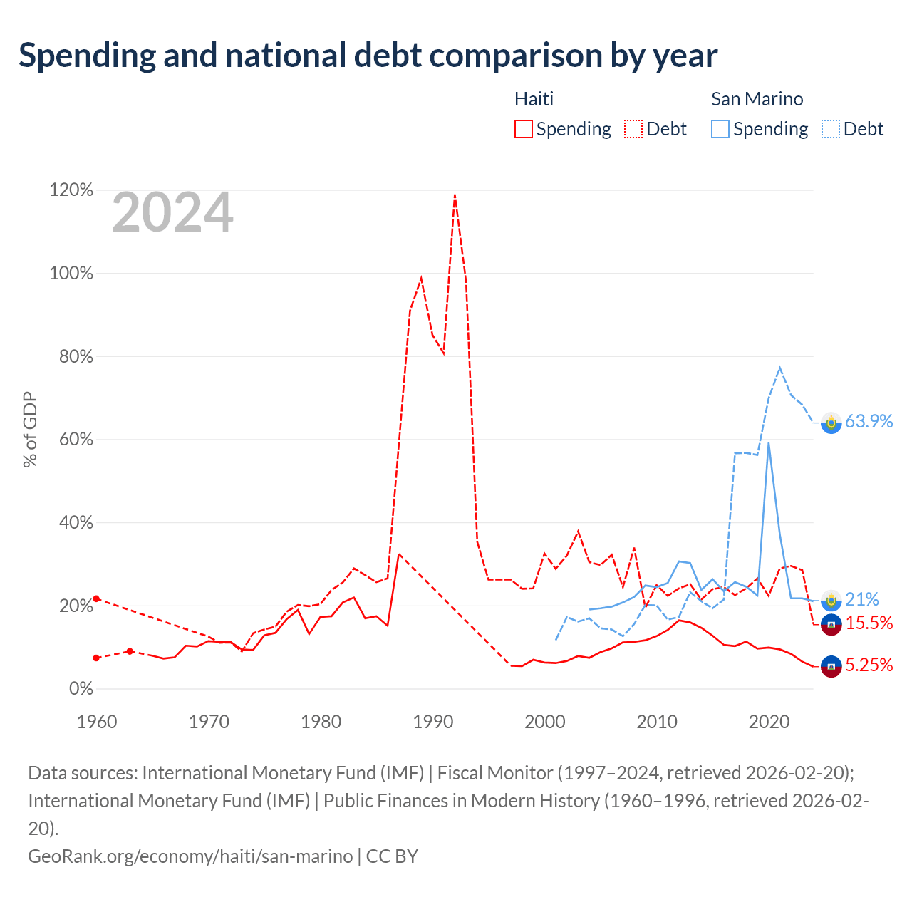 Haiti has $3.91B in government debt (15.5% of GDP), compared to $1.39B (63.9% of GDP) in San Marino.