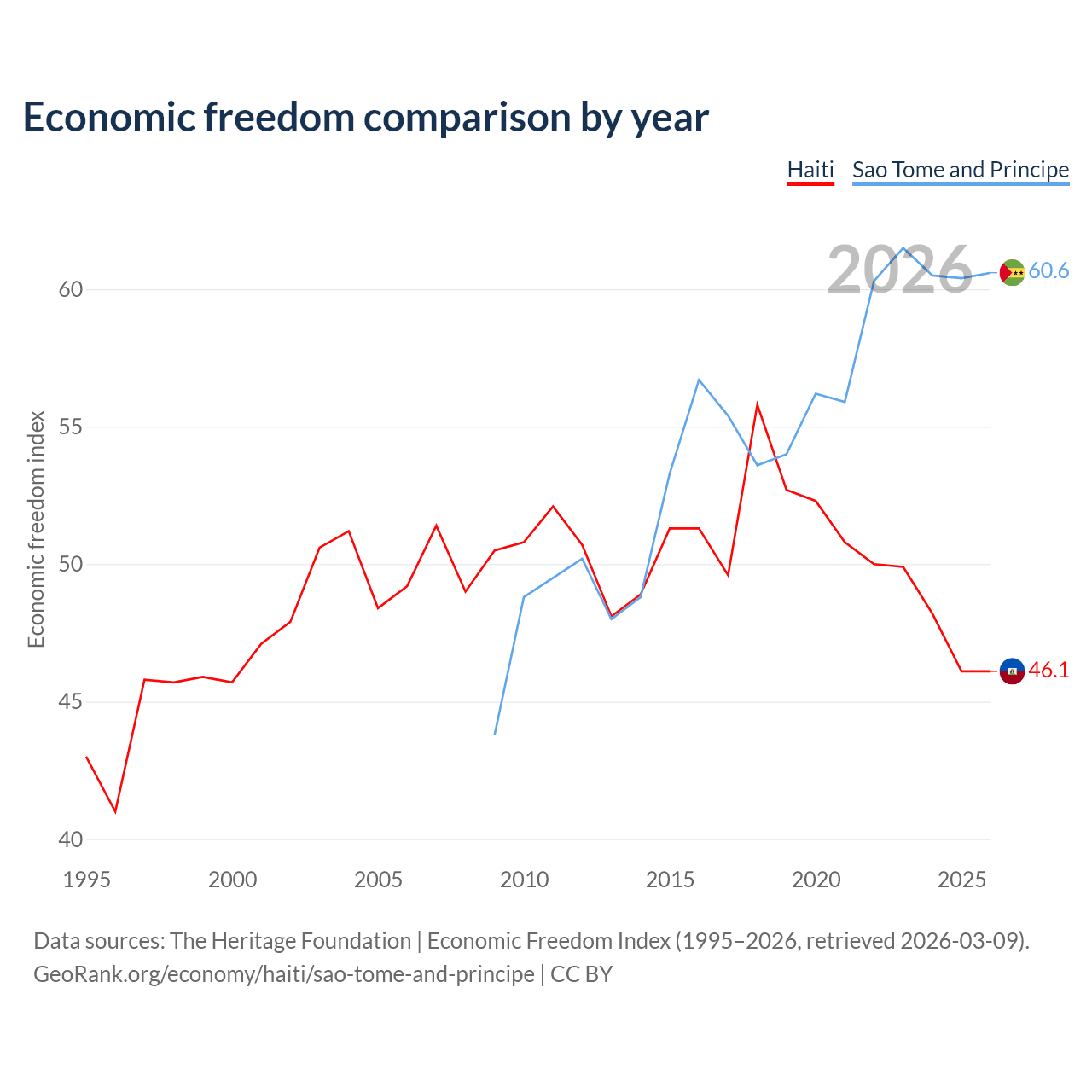 The Economic Freedom Index for Haiti is 46.1, ranking 178/197, compared to 60.6 for Sao Tome and Principe, ranking 93/197. The chart above displays a comparison of annual changes in economic freedom indexes.
