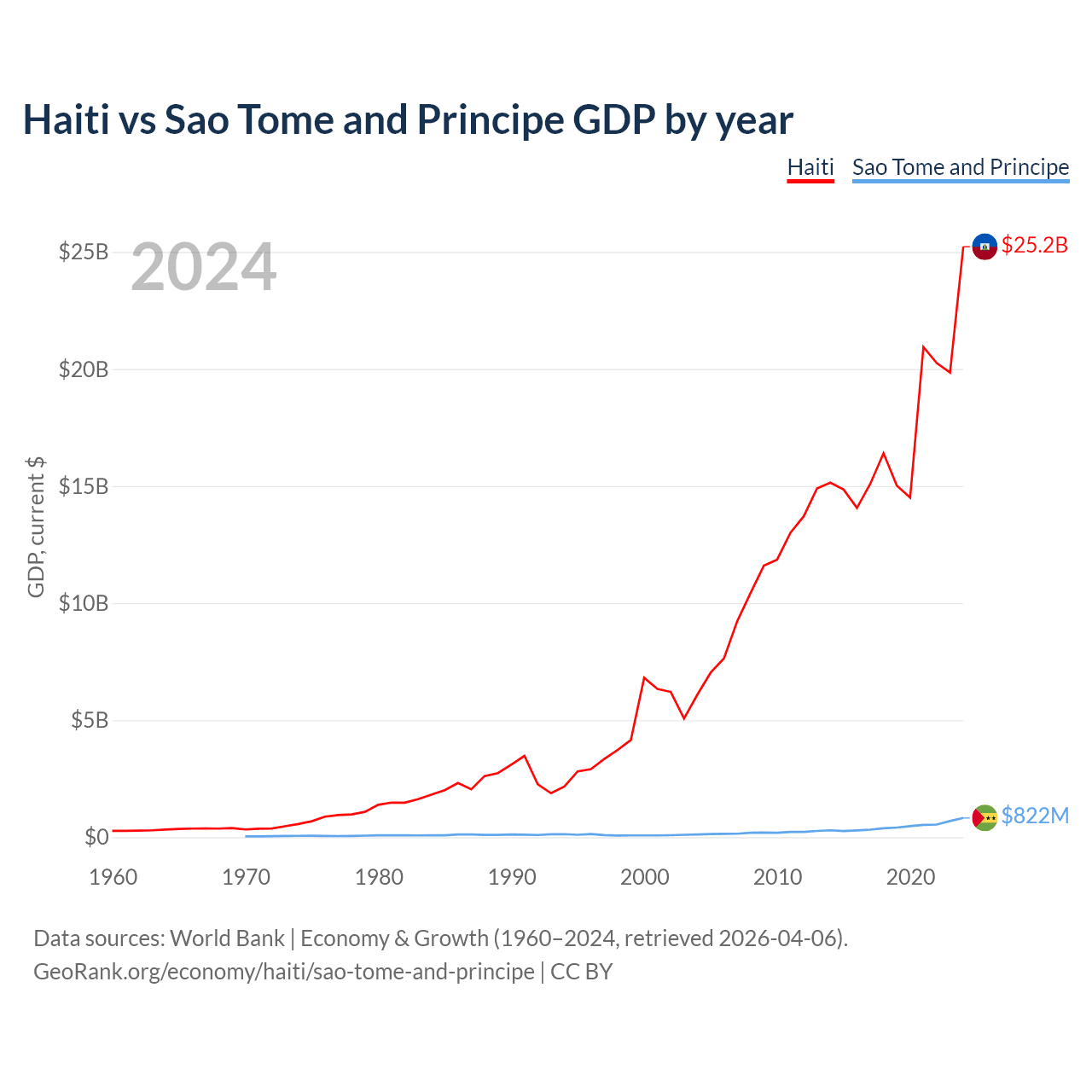 Haiti has a GDP of $25.2B compared to $822M for Sao Tome and Principe, ranking 117/197 and 189/197 by economy size, respectively.