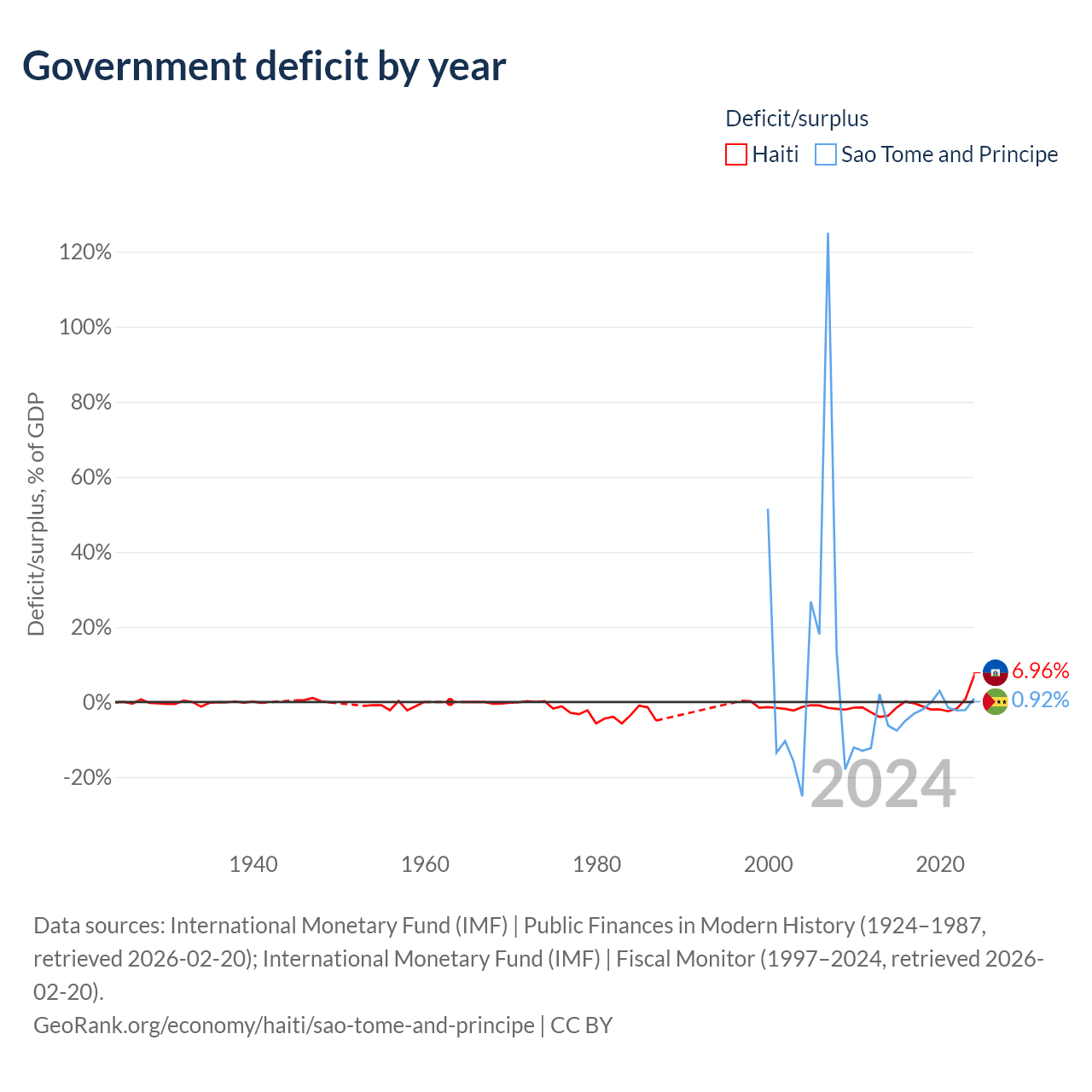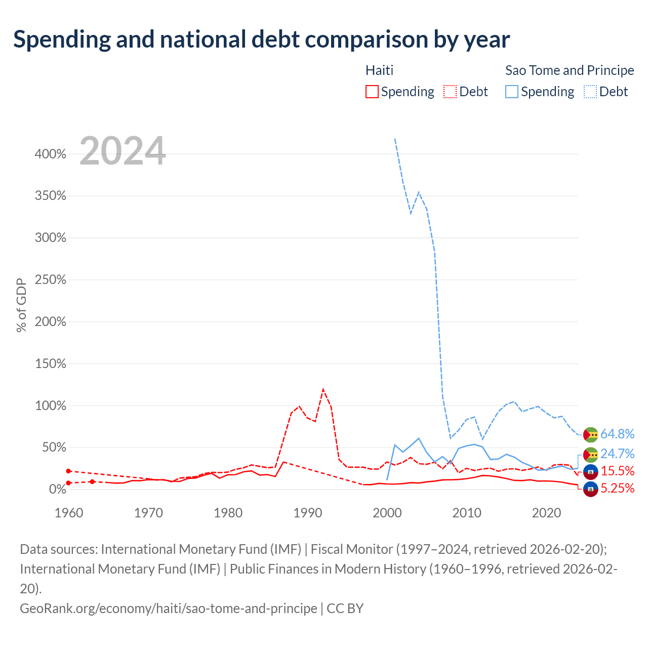 Haiti has $3.91B in government debt (15.5% of GDP), compared to $533M (64.8% of GDP) in Sao Tome and Principe.