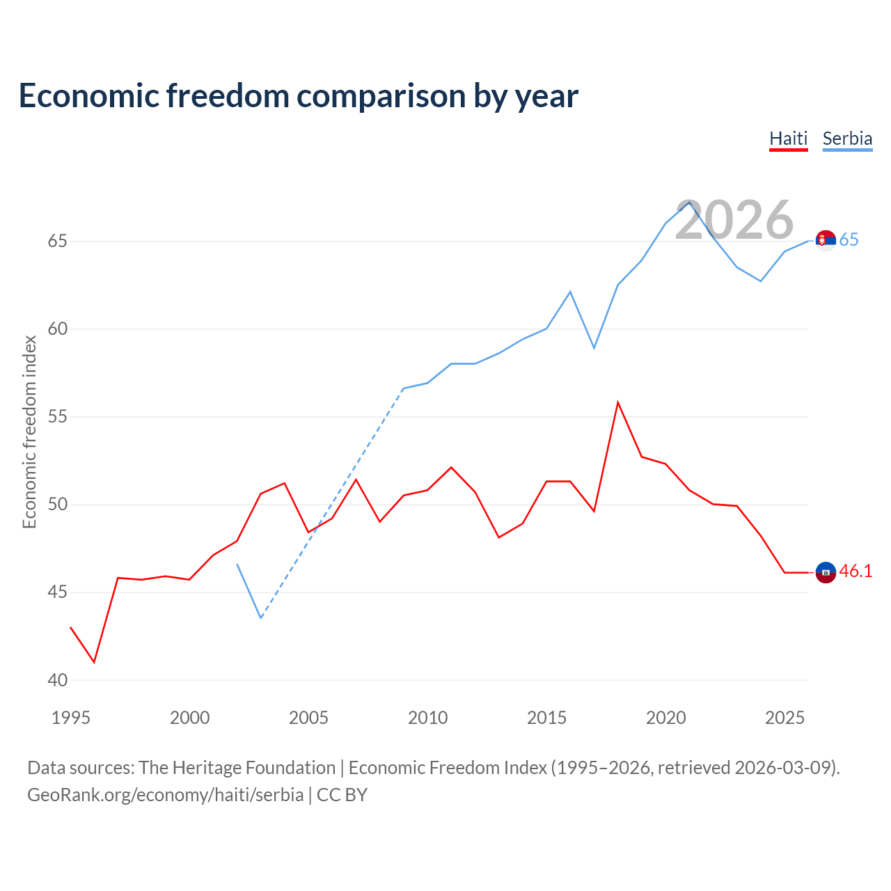The Economic Freedom Index for Haiti is 46.1, ranking 178/197, compared to 65 for Serbia, ranking 68/197. The chart above displays a comparison of annual changes in economic freedom indexes.