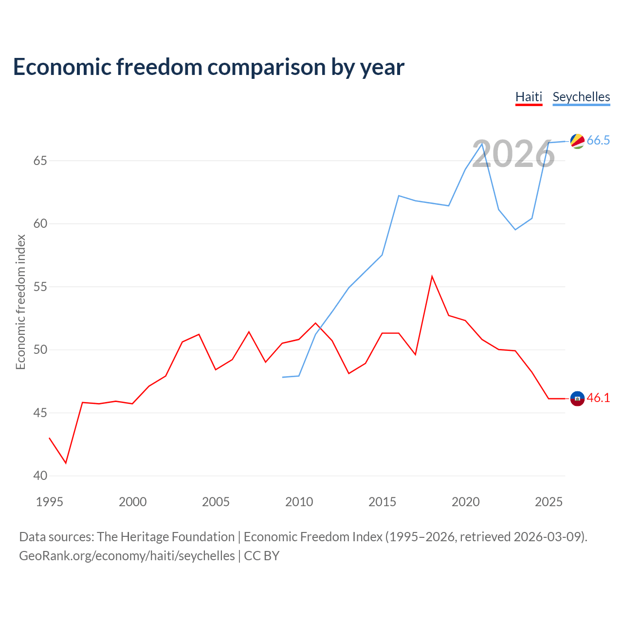 The Economic Freedom Index for Haiti is 46.1, ranking 178/197, compared to 66.5 for the Seychelles, ranking 60/197. The chart above displays a comparison of annual changes in economic freedom indexes.
