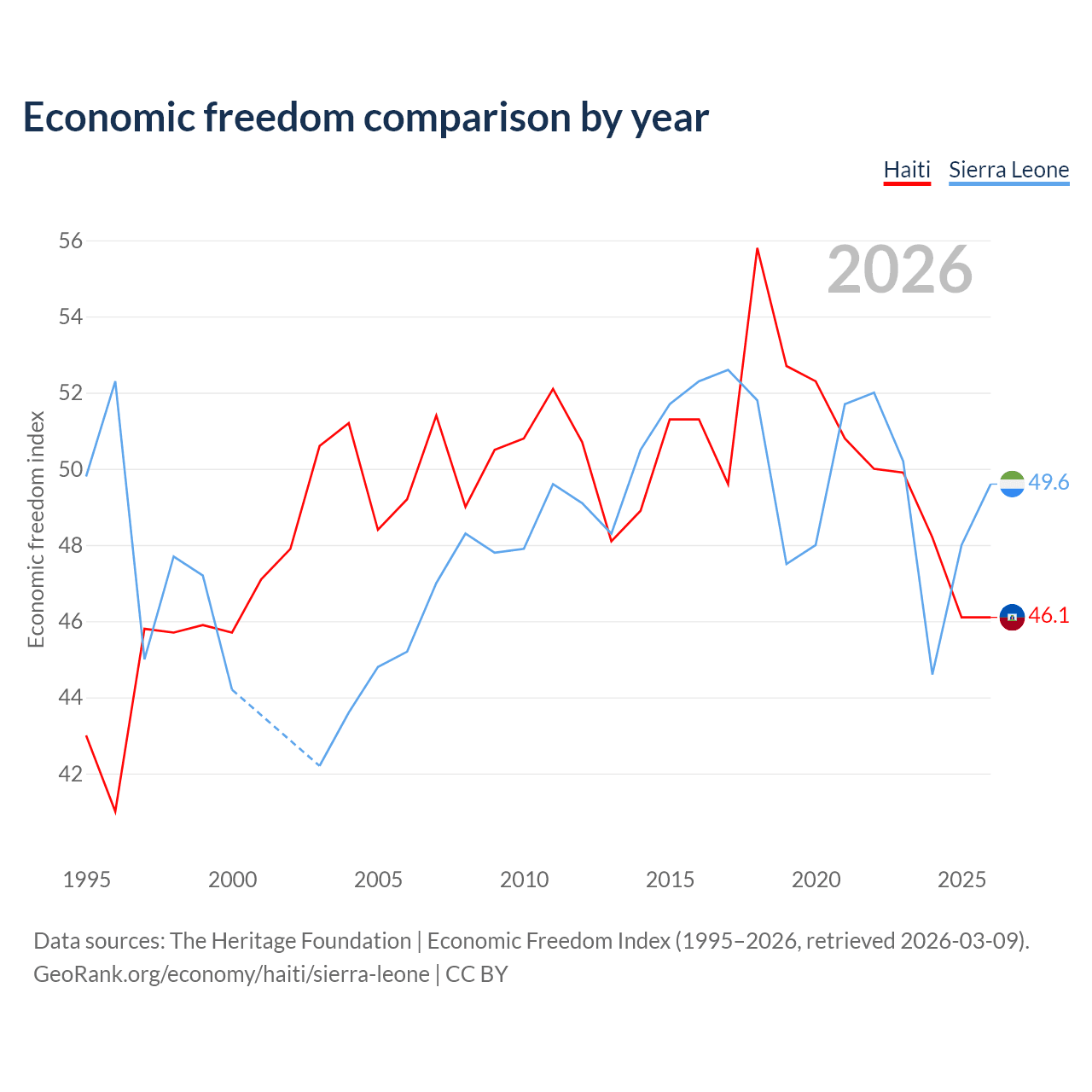 The Economic Freedom Index for Haiti is 46.1, ranking 178/197, compared to 49.6 for Sierra Leone, ranking 165/197. The chart above displays a comparison of annual changes in economic freedom indexes.