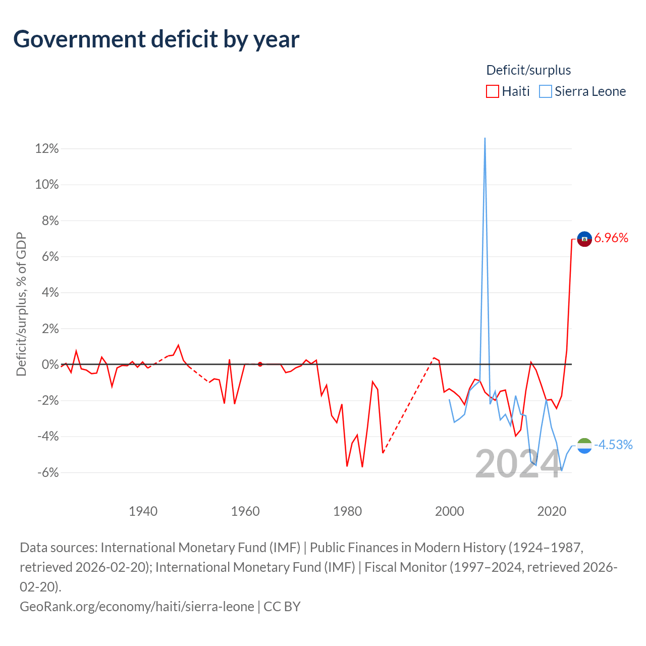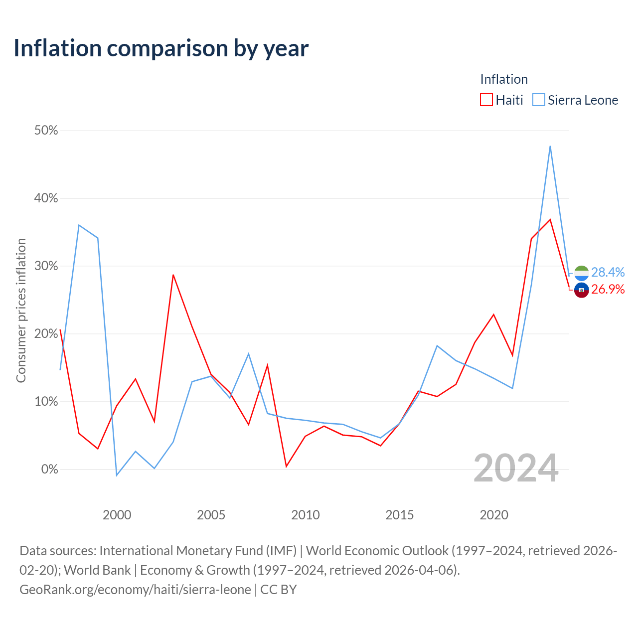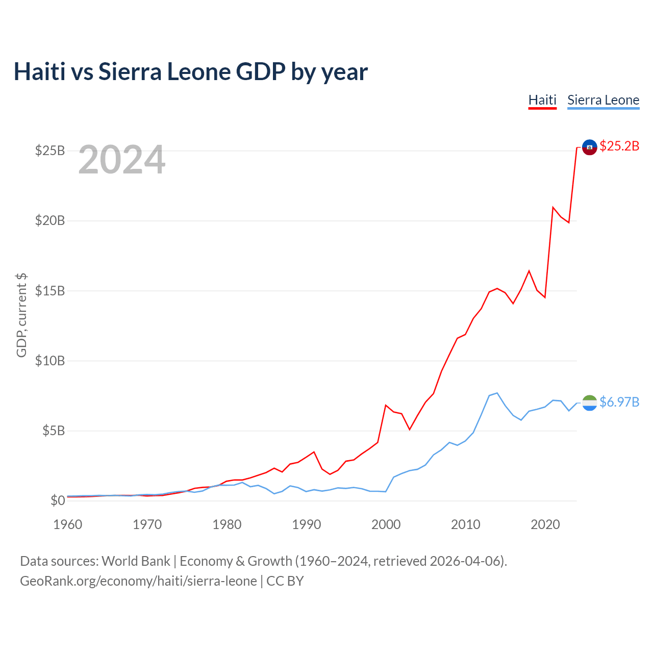 Haiti has a GDP of $25.2B compared to $6.97B for Sierra Leone, ranking 117/197 and 160/197 by economy size, respectively.