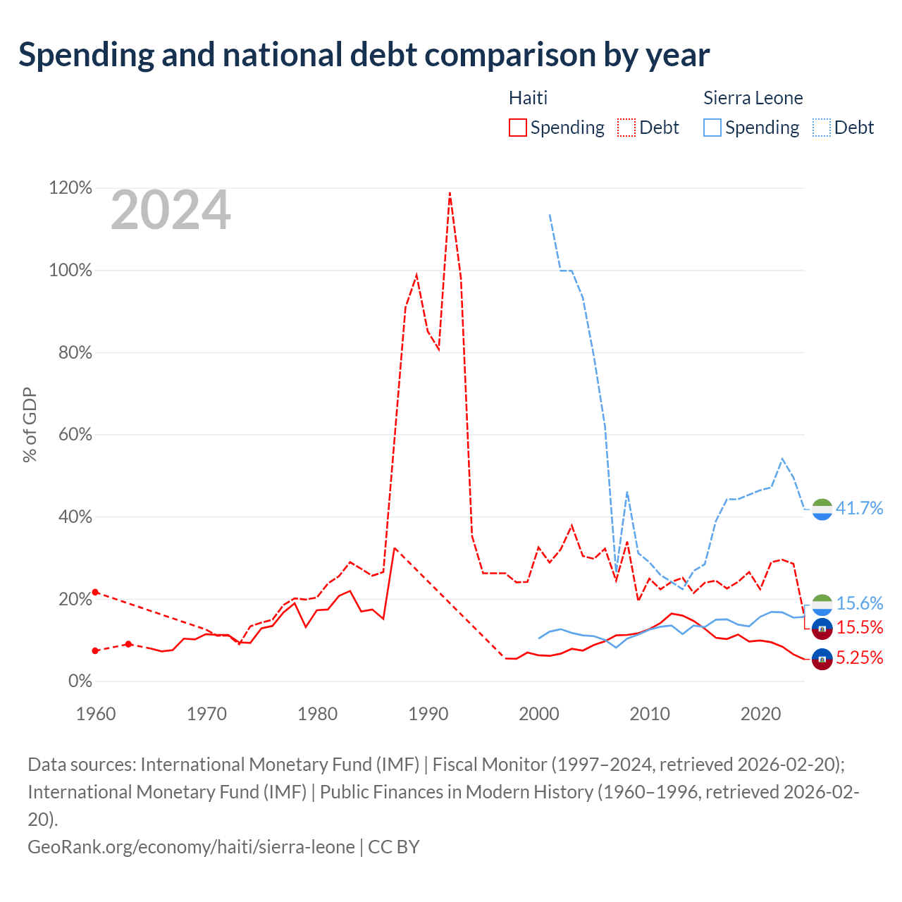 Haiti has $3.91B in government debt (15.5% of GDP), compared to $2.91B (41.7% of GDP) in Sierra Leone.