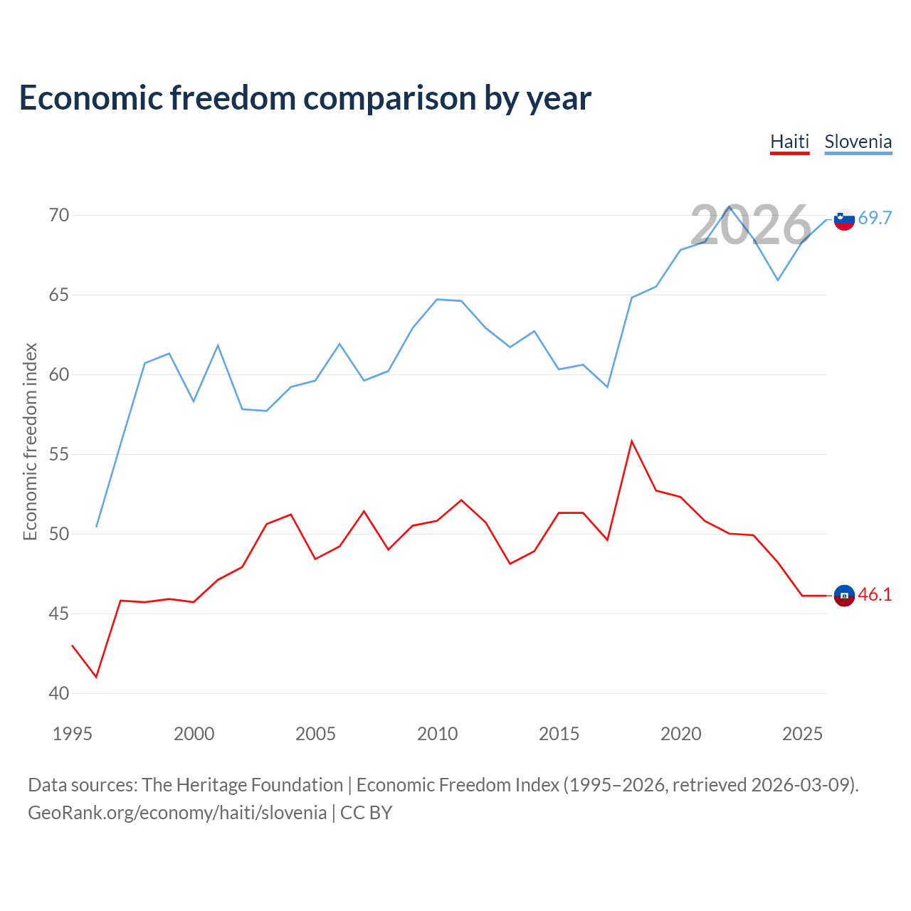 The Economic Freedom Index for Haiti is 46.1, ranking 178/197, compared to 69.7 for Slovenia, ranking 40/197. The chart above displays a comparison of annual changes in economic freedom indexes.