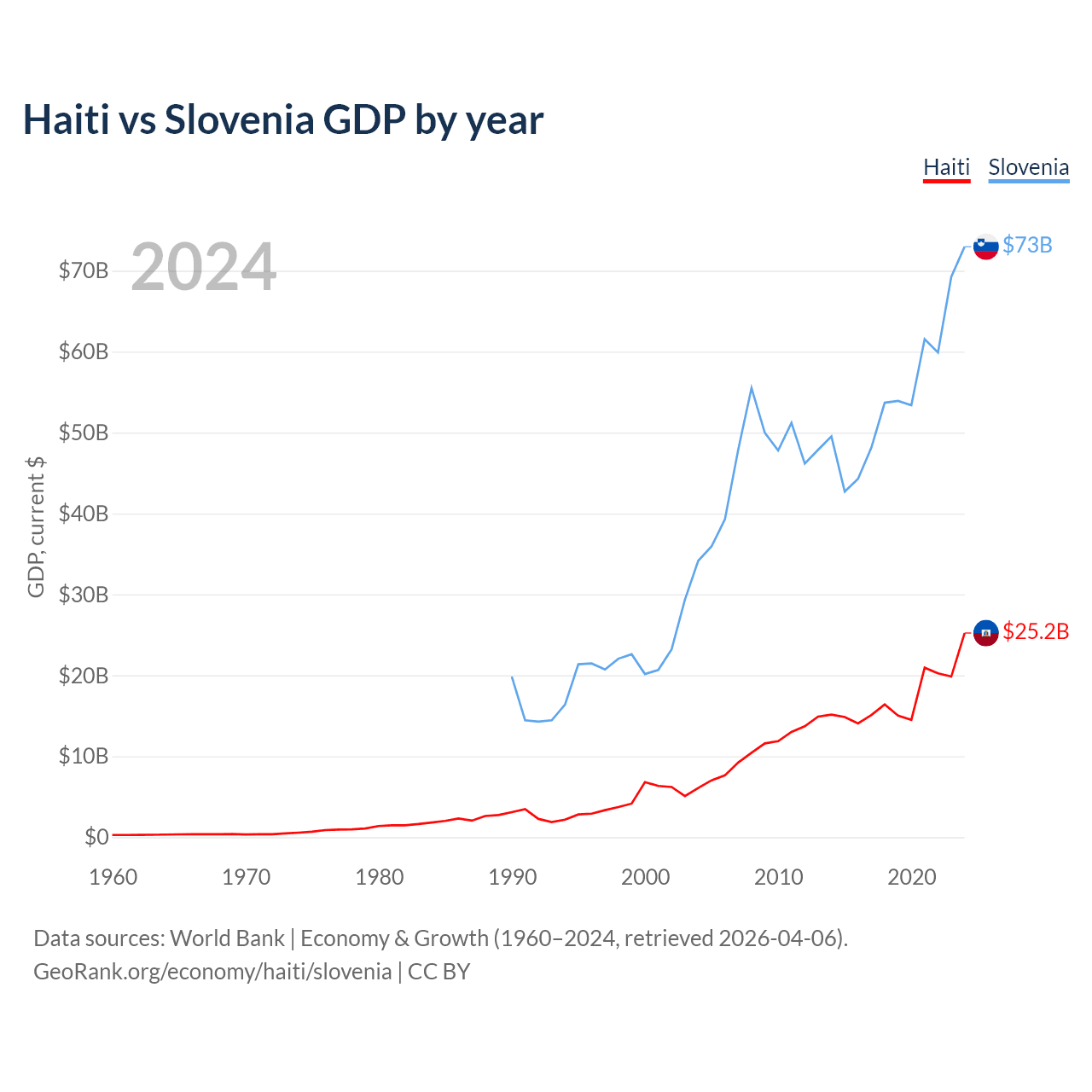 Haiti has a GDP of $25.2B compared to $73B for Slovenia, ranking 117/197 and 86/197 by economy size, respectively.