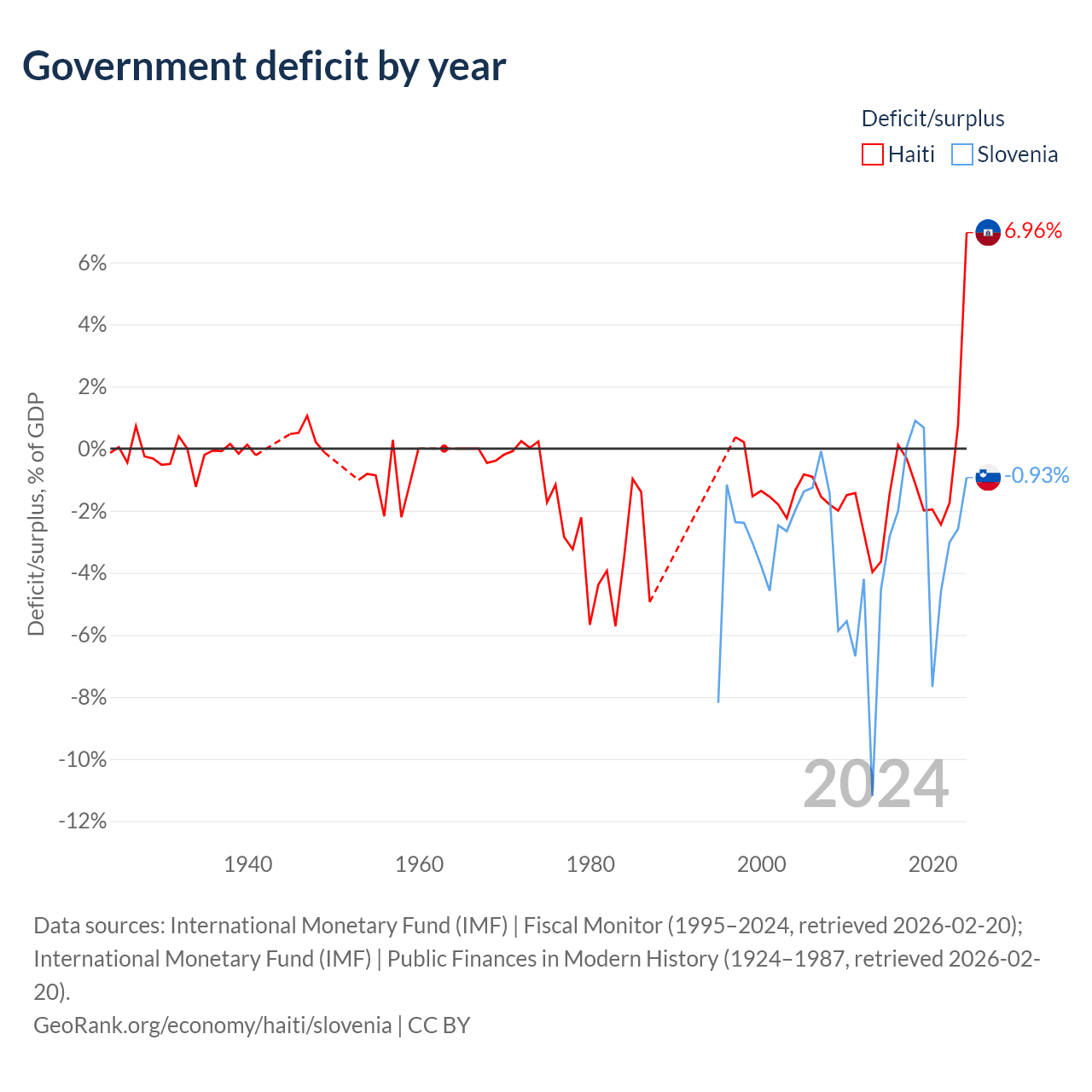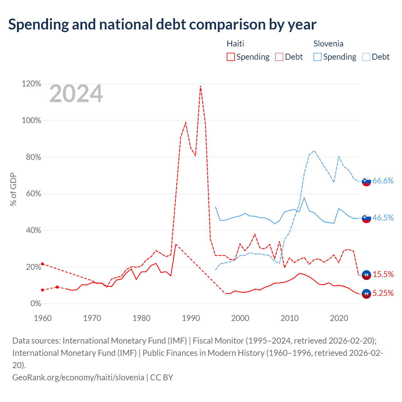 Haiti has $3.91B in government debt (15.5% of GDP), compared to $48.6B (66.6% of GDP) in Slovenia.