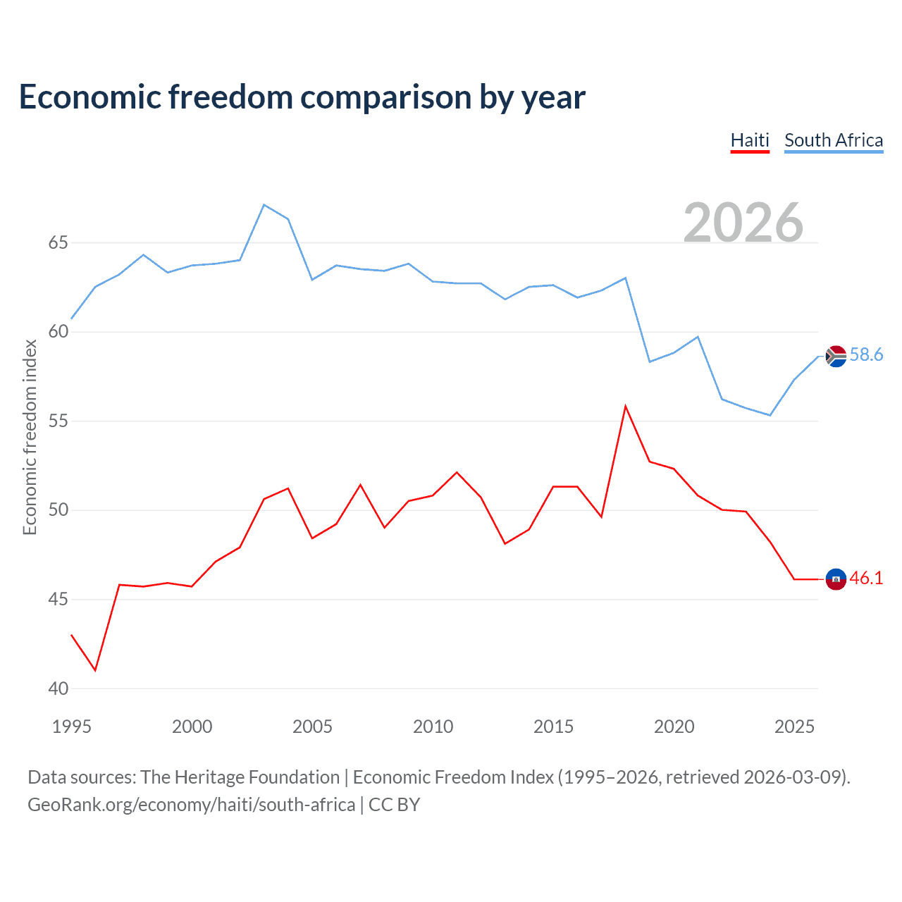 The Economic Freedom Index for Haiti is 46.1, ranking 178/197, compared to 58.6 for South Africa, ranking 110/197. The chart above displays a comparison of annual changes in economic freedom indexes.
