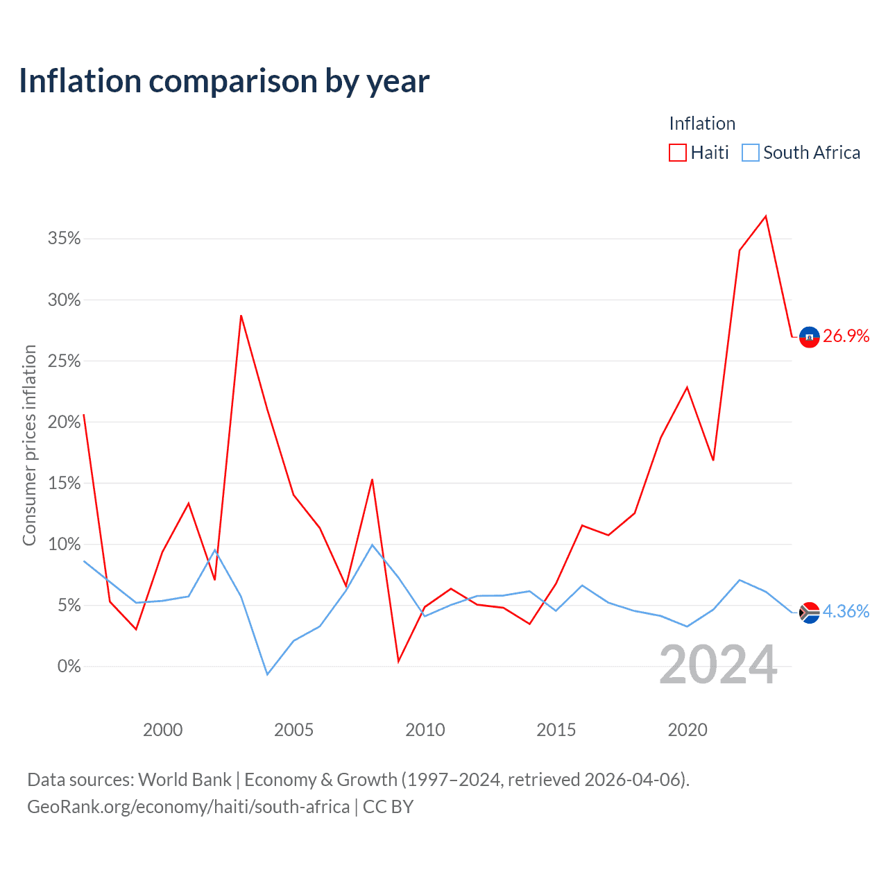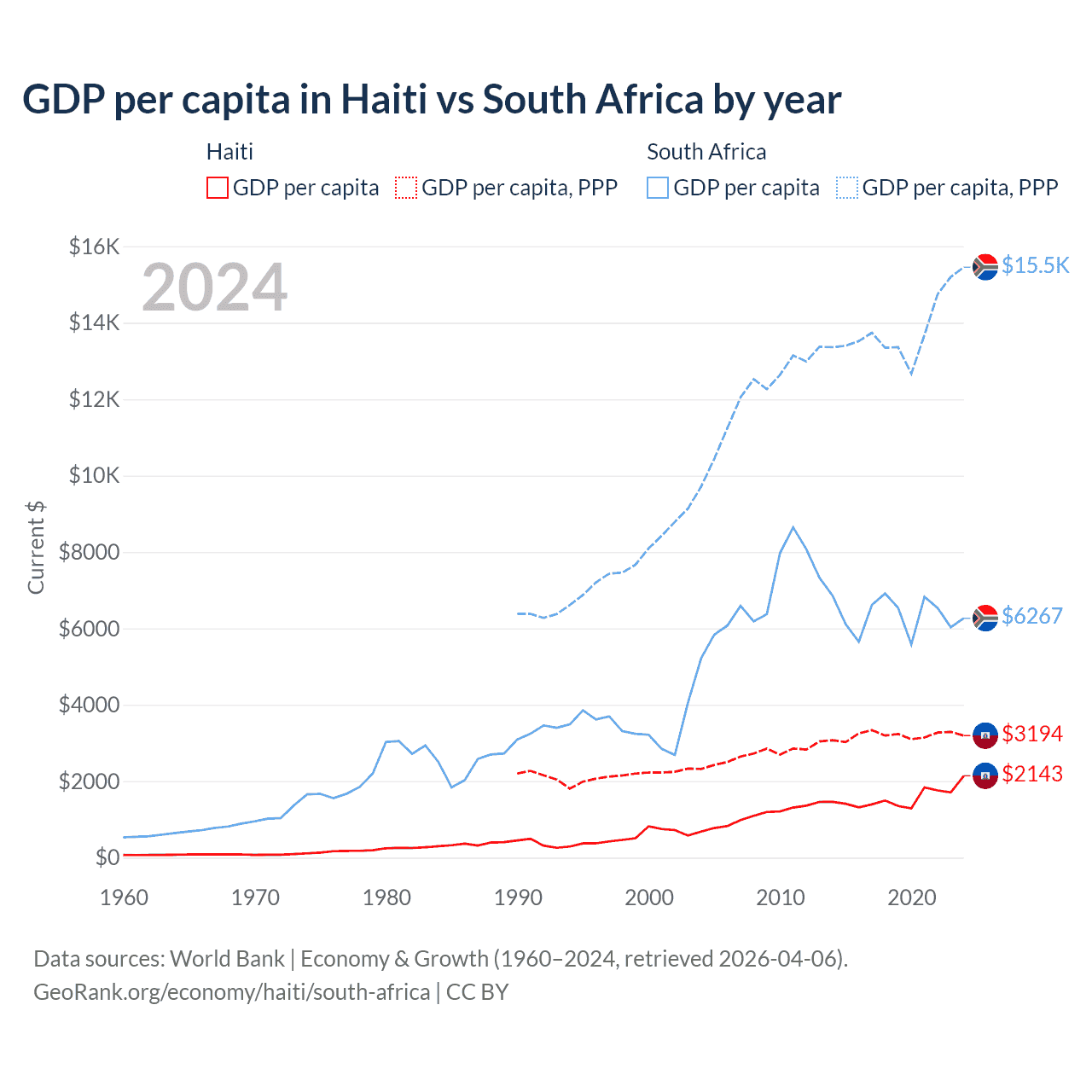 Haiti has a GDP of $25.2B compared to $401B for South Africa, ranking 117/197 and 40/197 by economy size, respectively.