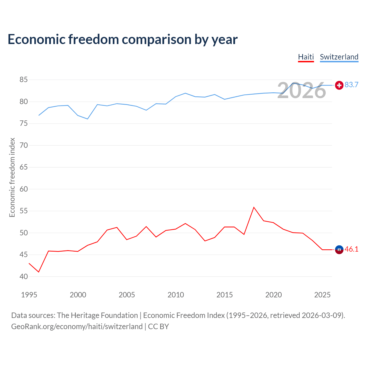 The Economic Freedom Index for Haiti is 46.1, ranking 178/197, compared to 83.7 for Switzerland, ranking 2/197. The chart above displays a comparison of annual changes in economic freedom indexes.