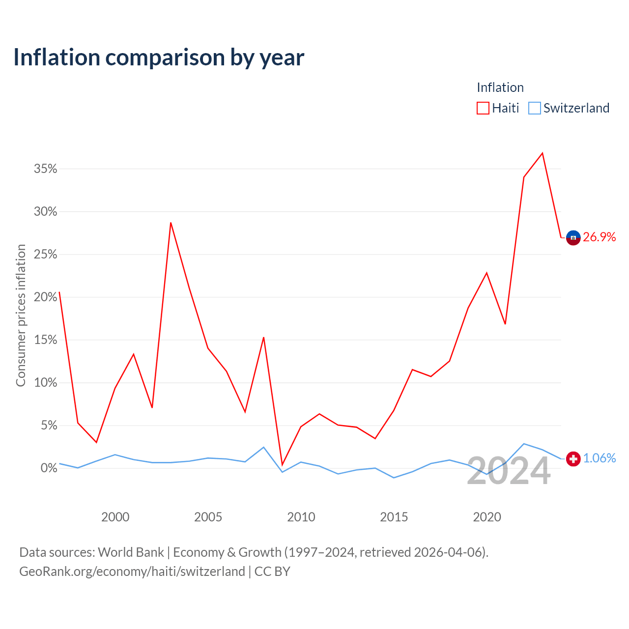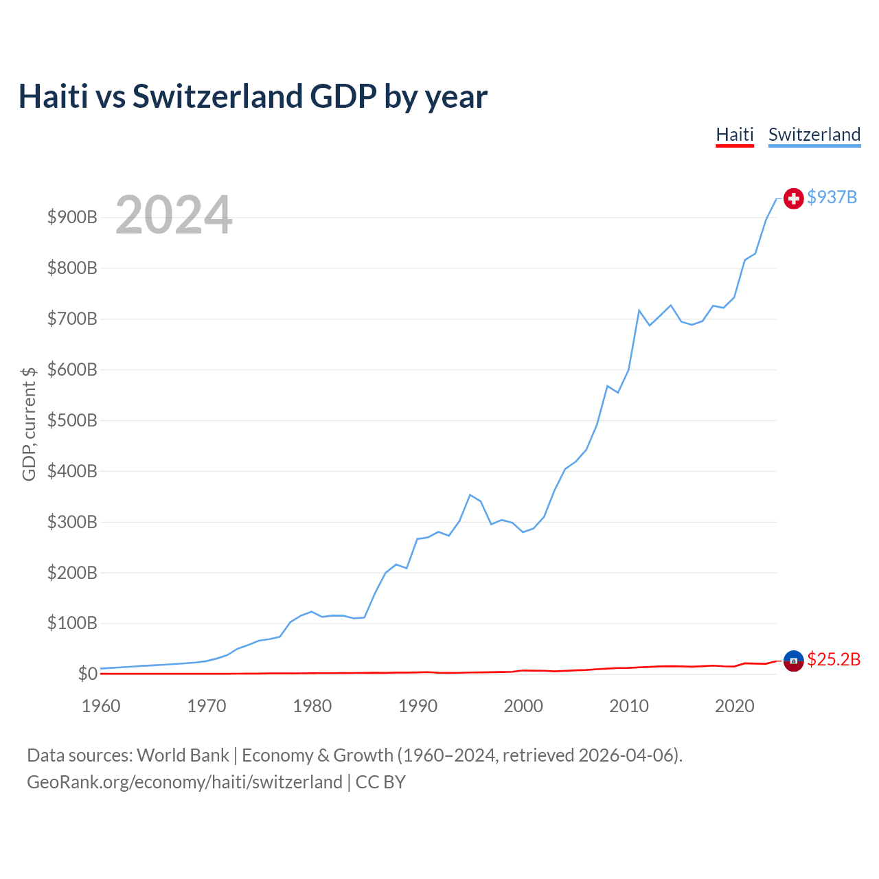 Haiti has a GDP of $25.2B compared to $937B for Switzerland, ranking 117/197 and 20/197 by economy size, respectively.