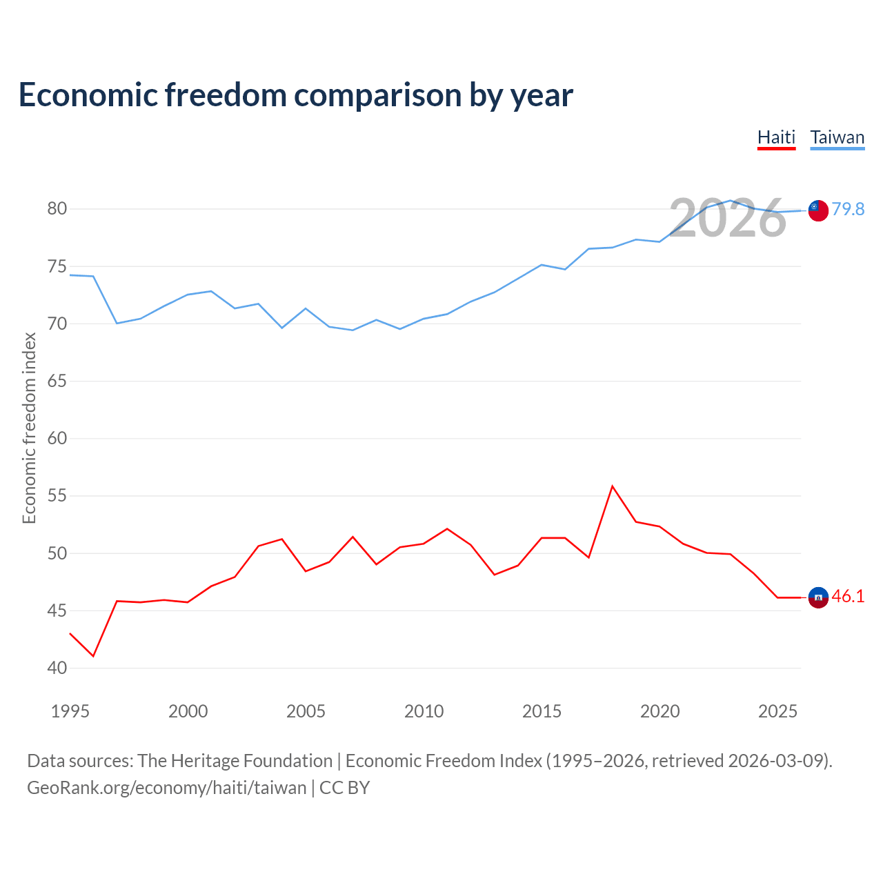 The Economic Freedom Index for Haiti is 46.1, ranking 178/197, compared to 79.8 for Taiwan, ranking 6/197. The chart above displays a comparison of annual changes in economic freedom indexes.