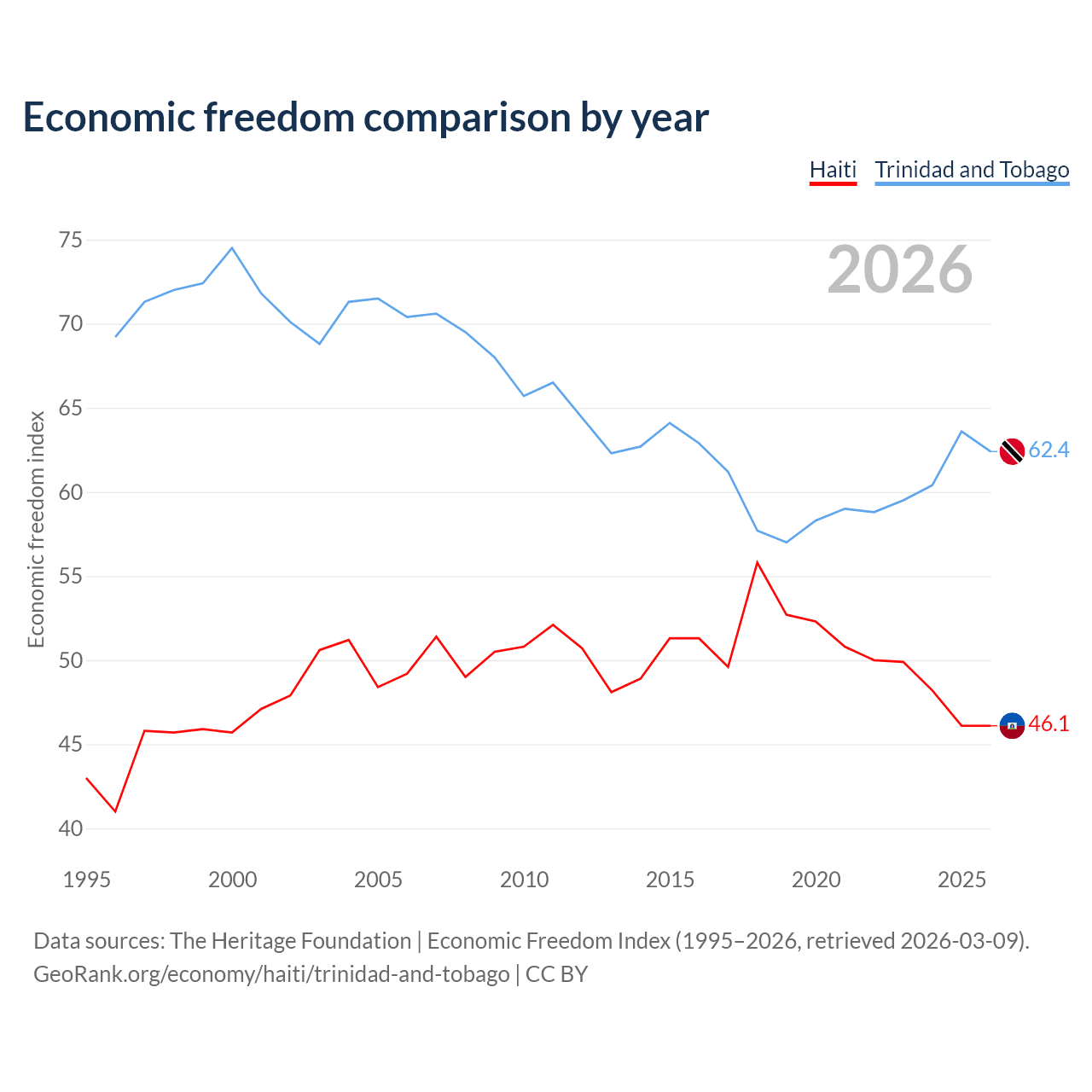 The Economic Freedom Index for Haiti is 46.1, ranking 178/197, compared to 62.4 for Trinidad and Tobago, ranking 87/197. The chart above displays a comparison of annual changes in economic freedom indexes.