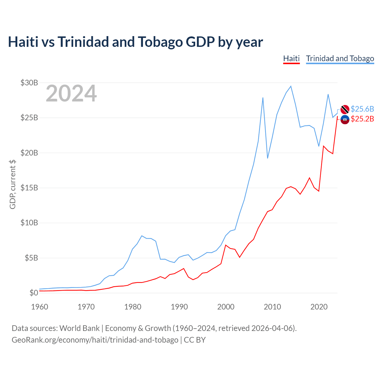 Haiti has a GDP of $25.2B compared to $25.6B for Trinidad and Tobago, ranking 117/197 and 115/197 by economy size, respectively.
