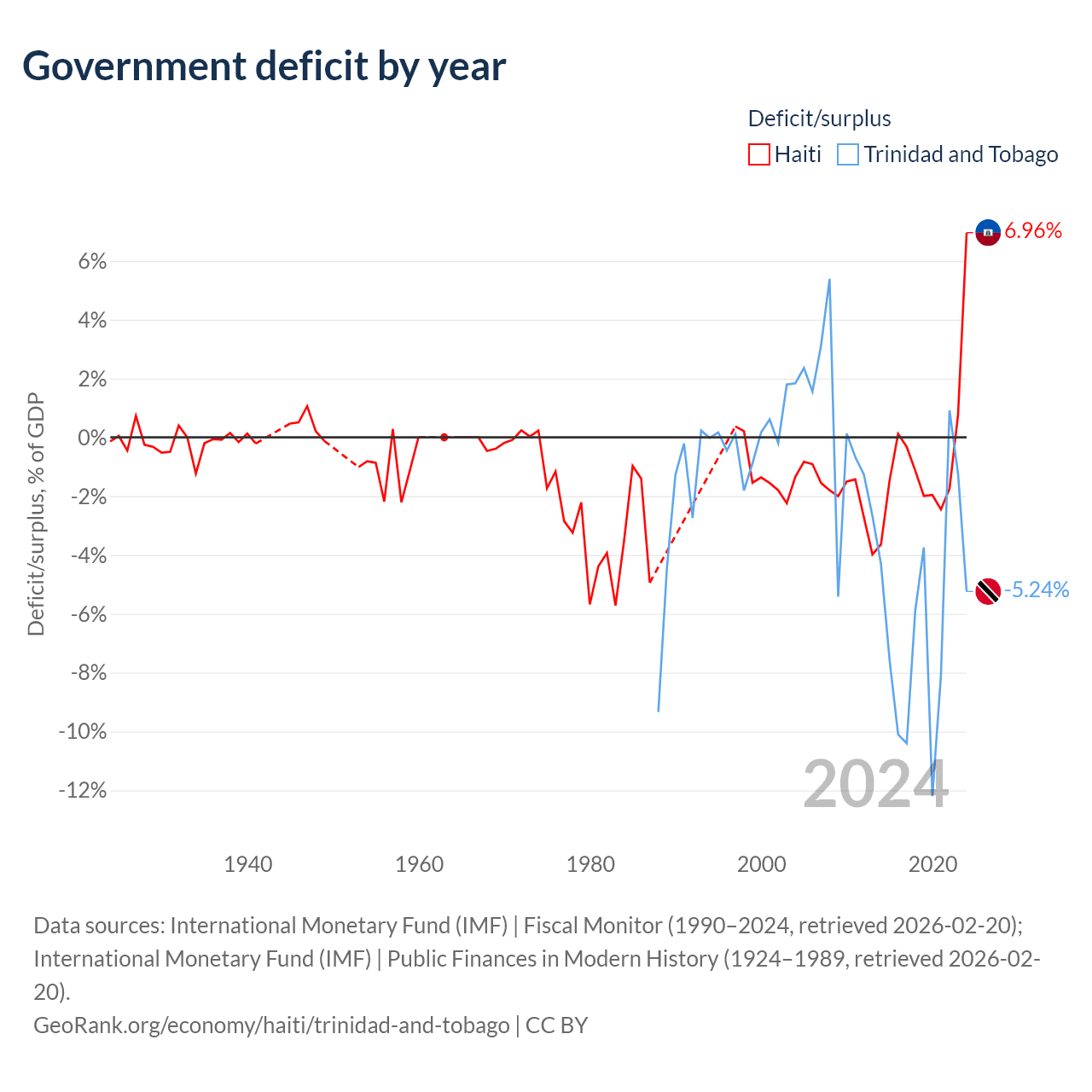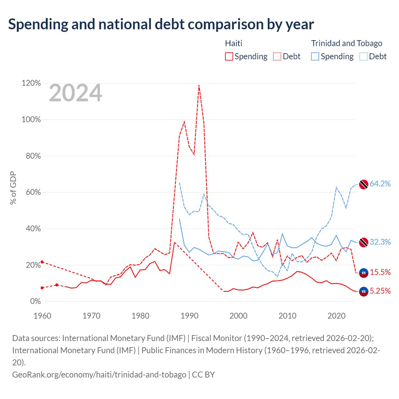 Haiti has $3.91B in government debt (15.5% of GDP), compared to $16.5B (64.2% of GDP) in Trinidad and Tobago.
