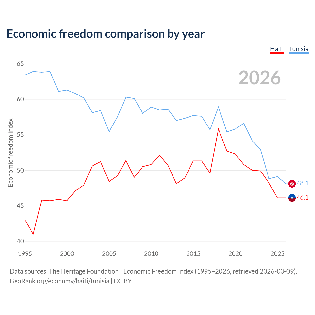 The Economic Freedom Index for Haiti is 46.1, ranking 178/197, compared to 48.1 for Tunisia, ranking 172/197. The chart above displays a comparison of annual changes in economic freedom indexes.