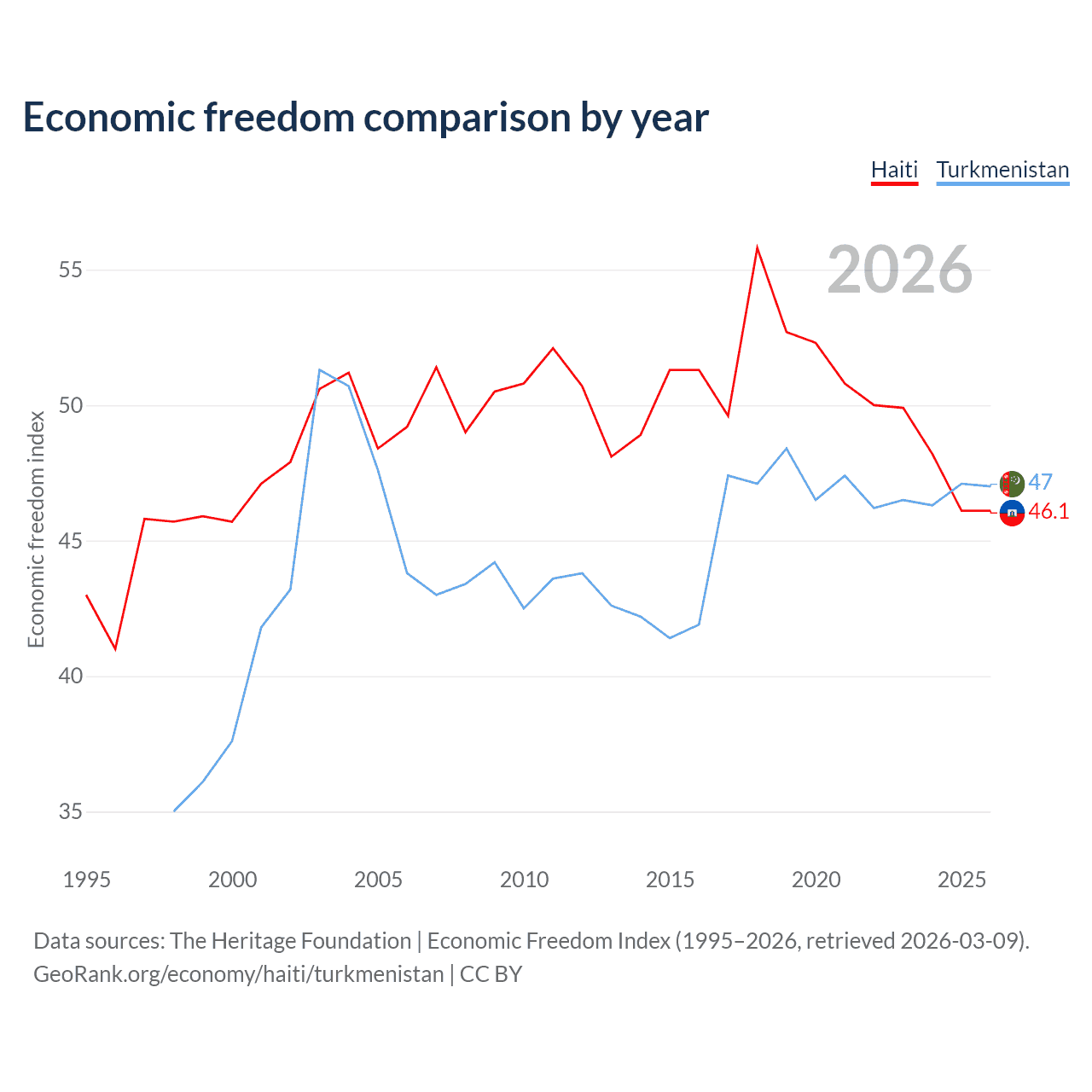 The Economic Freedom Index for Haiti is 46.1, ranking 178/197, compared to 47 for Turkmenistan, ranking 177/197. The chart above displays a comparison of annual changes in economic freedom indexes.