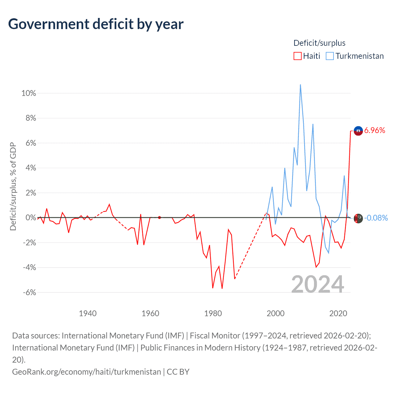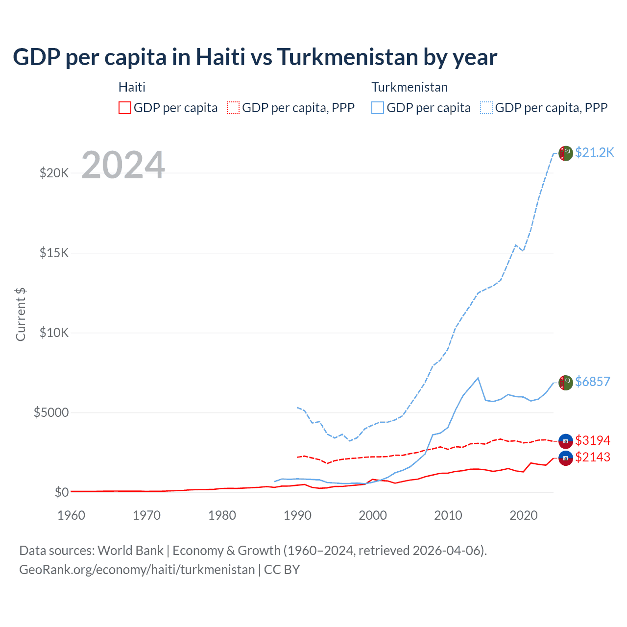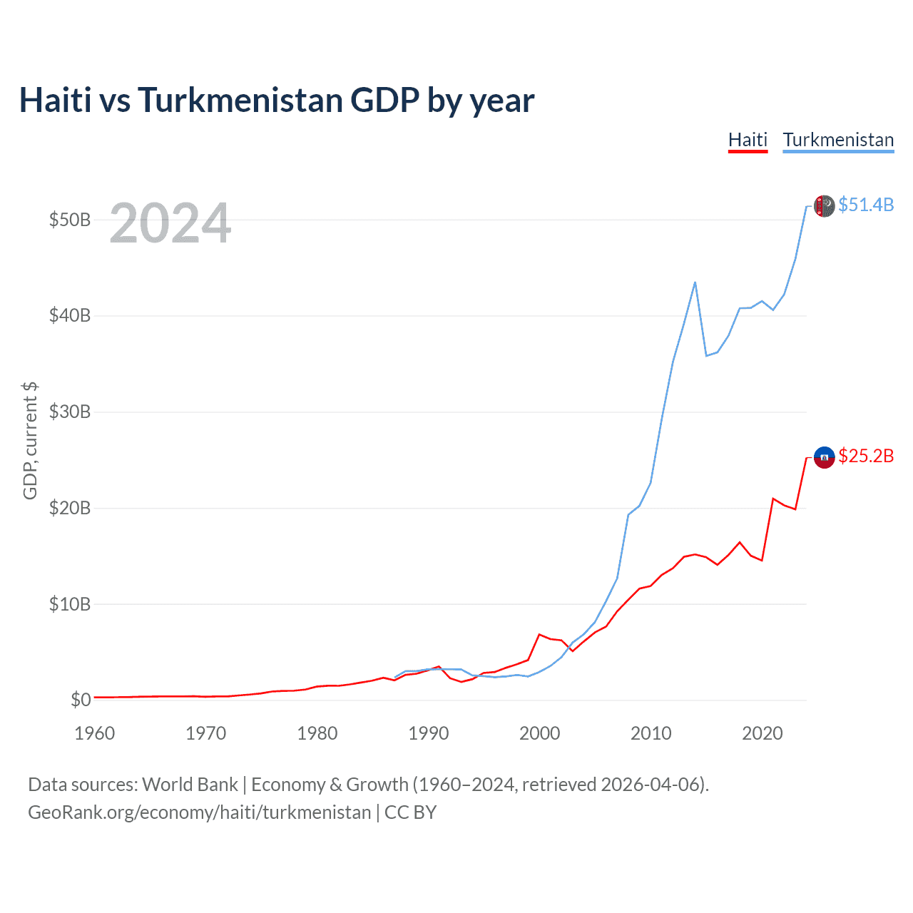 Haiti has a GDP of $25.2B compared to $51.4B for Turkmenistan, ranking 117/197 and 92/197 by economy size, respectively.
