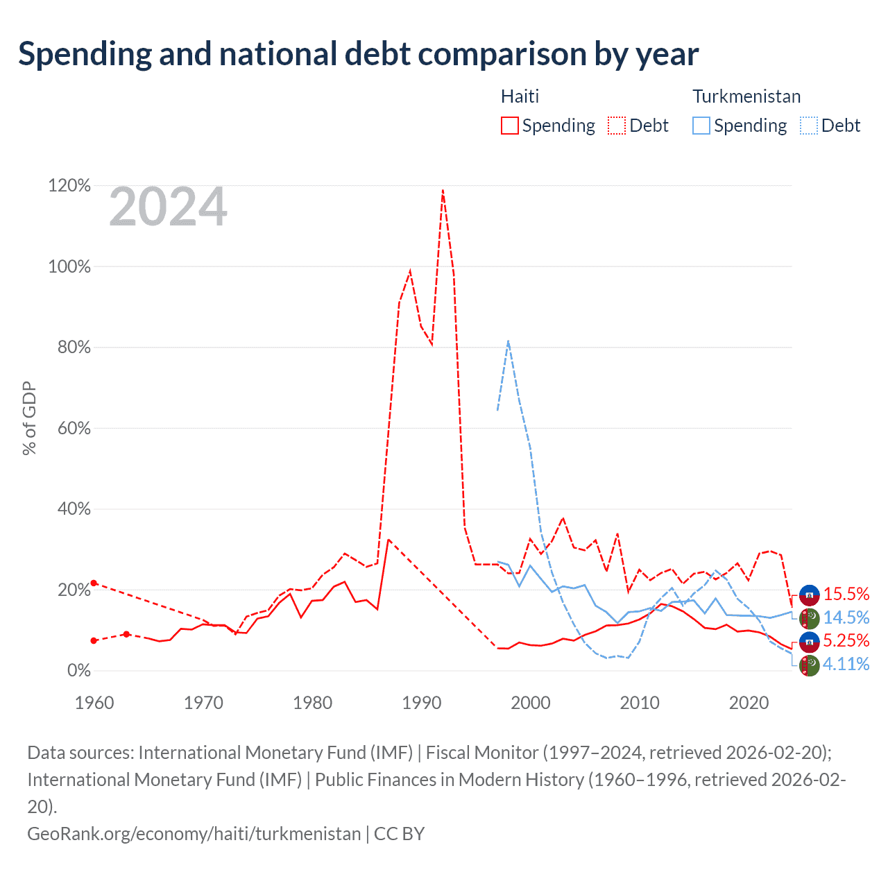 Haiti has $3.91B in government debt (15.5% of GDP), compared to $2.11B (4.11% of GDP) in Turkmenistan.