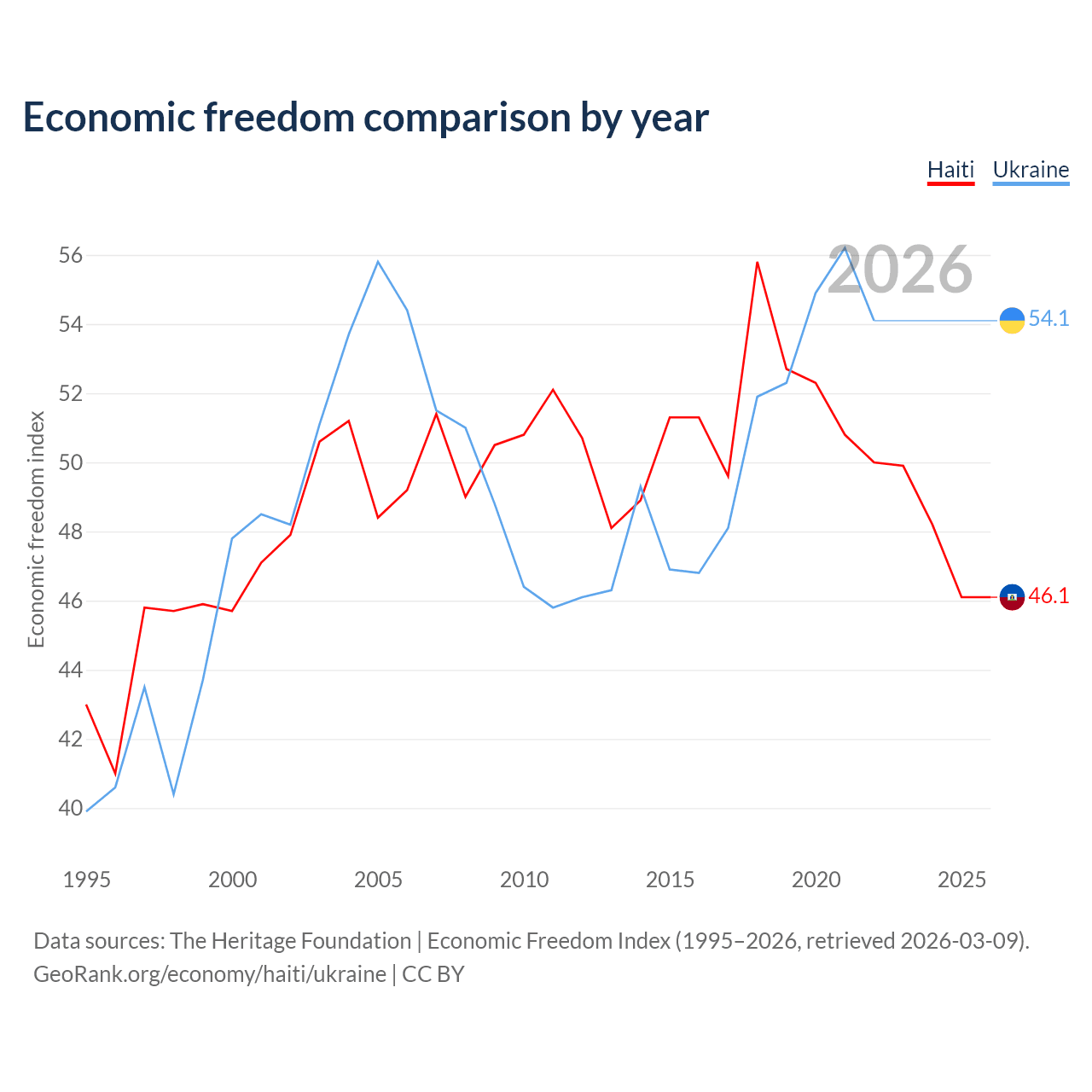 The Economic Freedom Index for Haiti is 46.1, ranking 178/197, compared to 54.1 for Ukraine, ranking 135/197. The chart above displays a comparison of annual changes in economic freedom indexes.