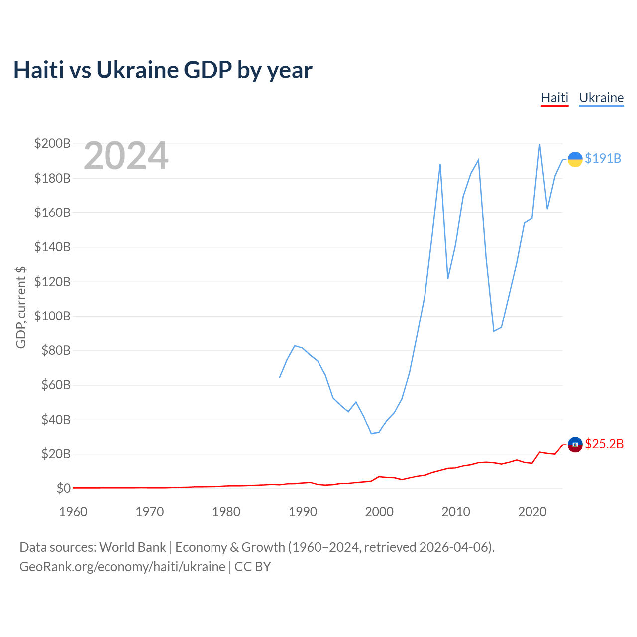 Haiti has a GDP of $25.2B compared to $191B for Ukraine, ranking 117/197 and 57/197 by economy size, respectively.