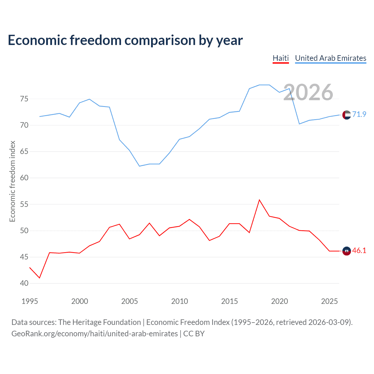 The Economic Freedom Index for Haiti is 46.1, ranking 178/197, compared to 71.9 for the United Arab Emirates, ranking 29/197. The chart above displays a comparison of annual changes in economic freedom indexes.