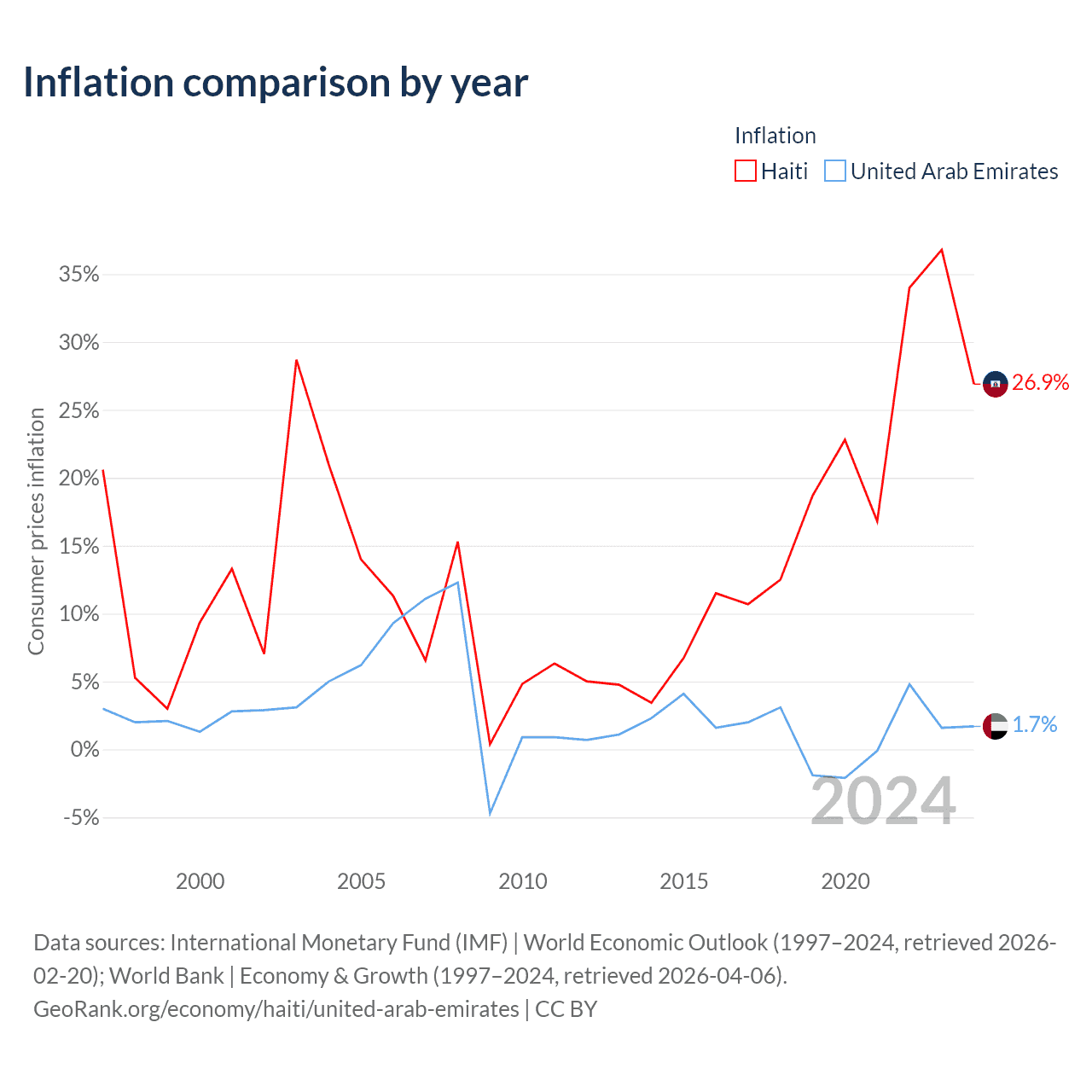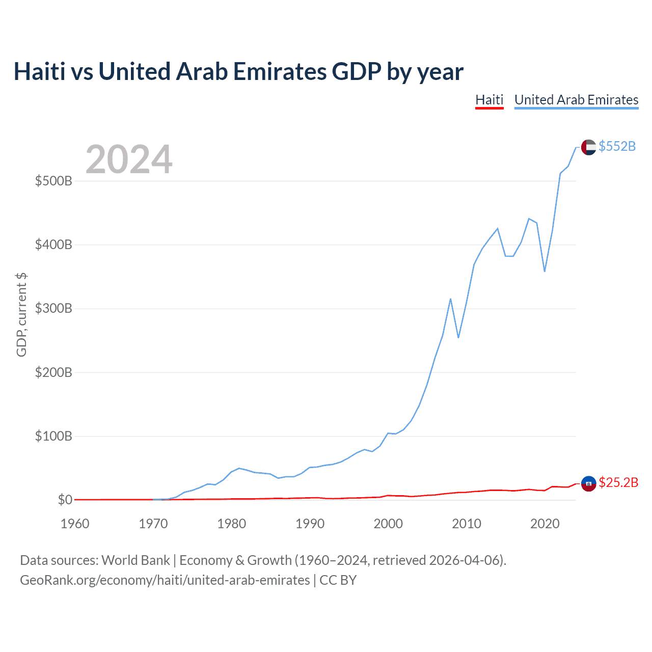 Haiti has a GDP of $25.2B compared to $552B for the United Arab Emirates, ranking 117/197 and 27/197 by economy size, respectively.