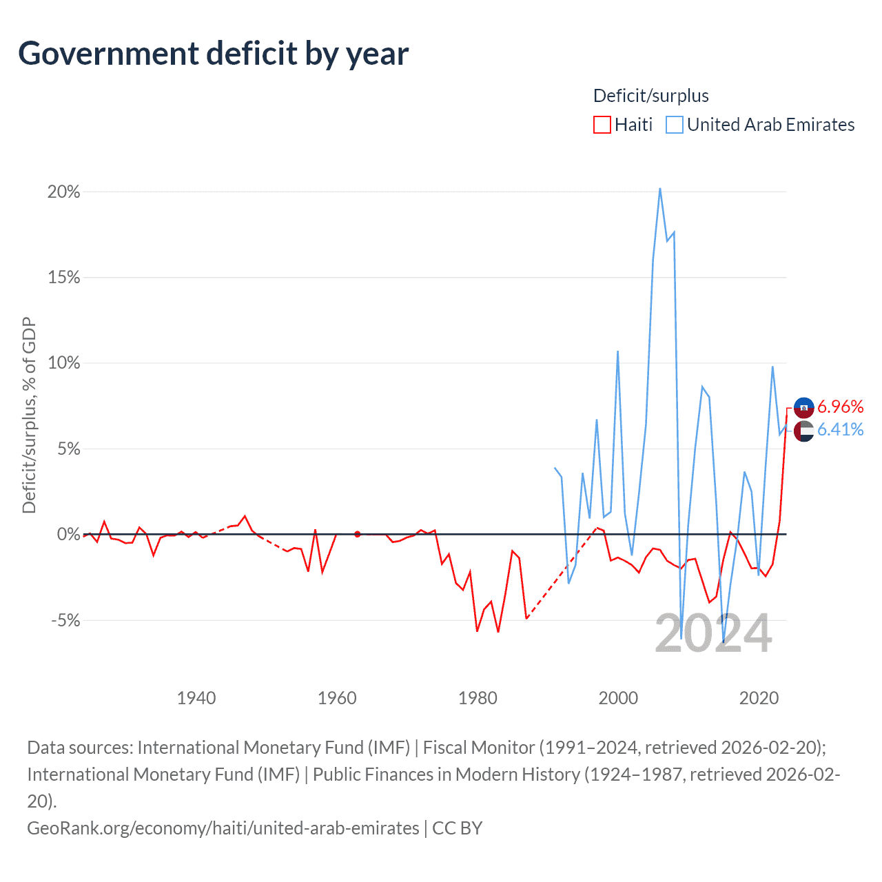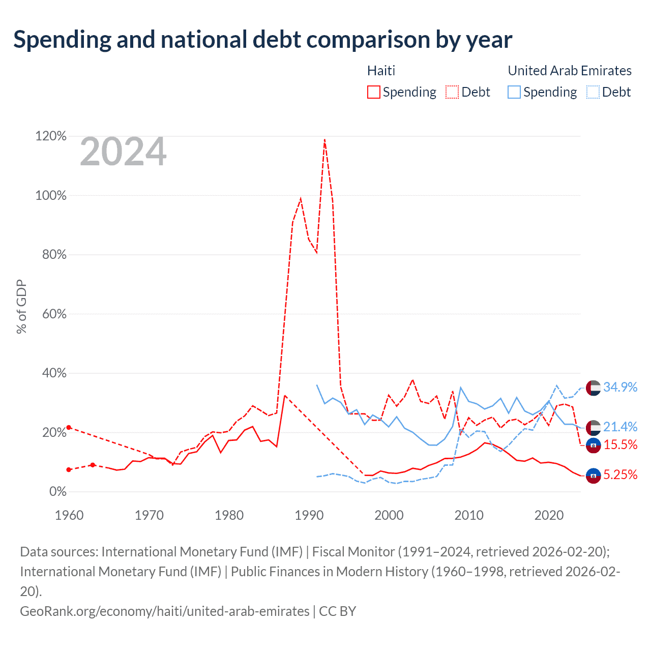 Haiti has $3.91B in government debt (15.5% of GDP), compared to $193B (34.9% of GDP) in the United Arab Emirates.