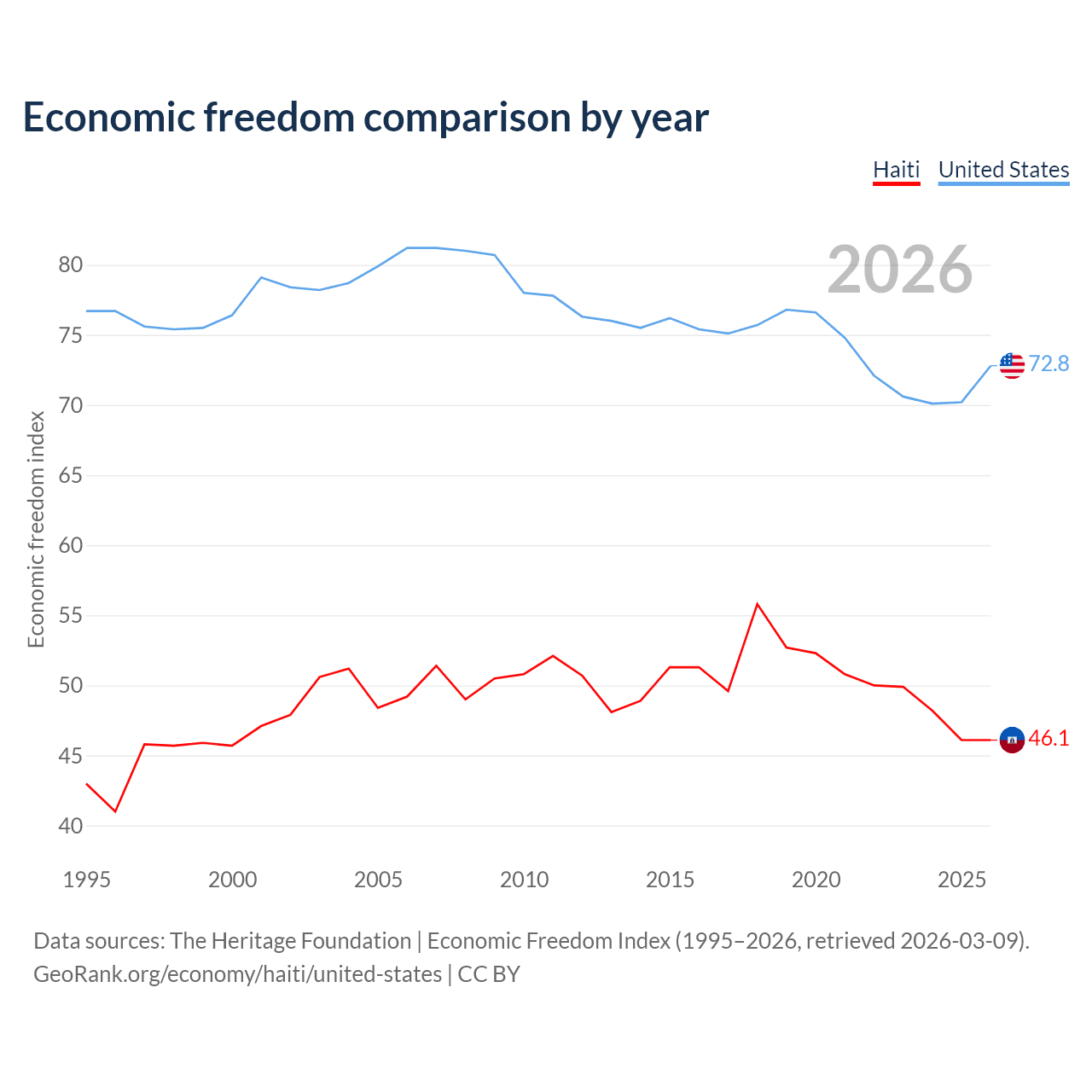 The Economic Freedom Index for Haiti is 46.1, ranking 178/197, compared to 72.8 for the United States, ranking 27/197. The chart above displays a comparison of annual changes in economic freedom indexes.