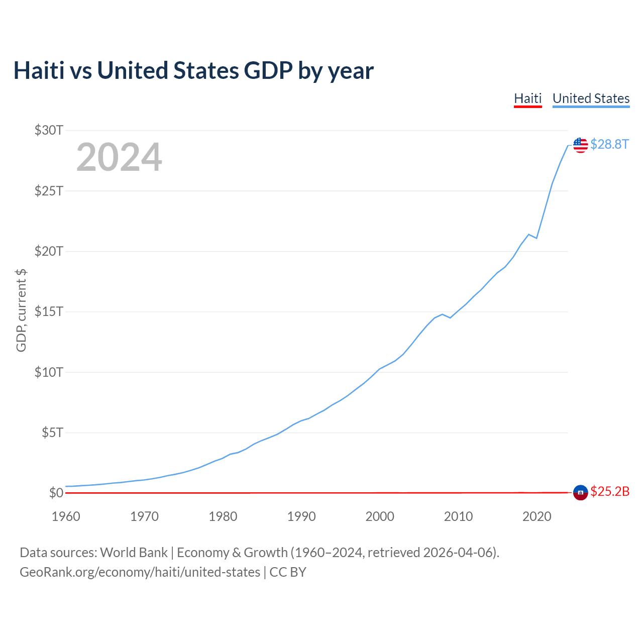 Haiti has a GDP of $25.2B compared to $28.8T for the United States, ranking 117/197 and 1/197 by economy size, respectively.