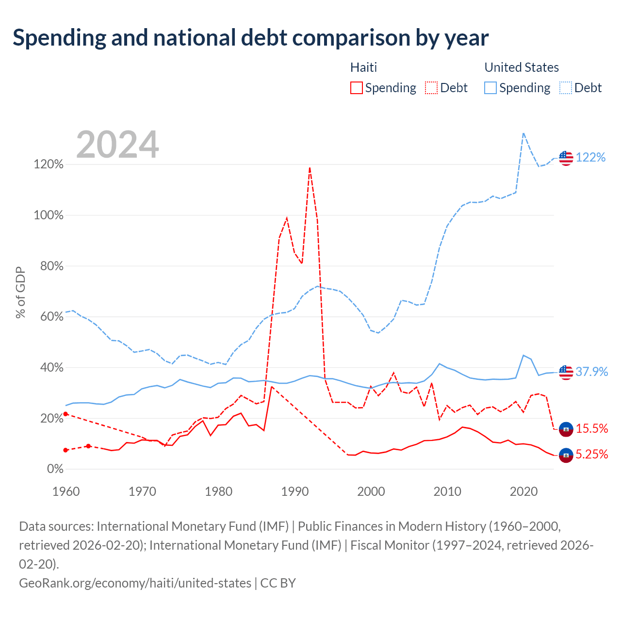 Haiti has $3.91B in government debt (15.5% of GDP), compared to $35.2T (122.3% of GDP) in the United States.