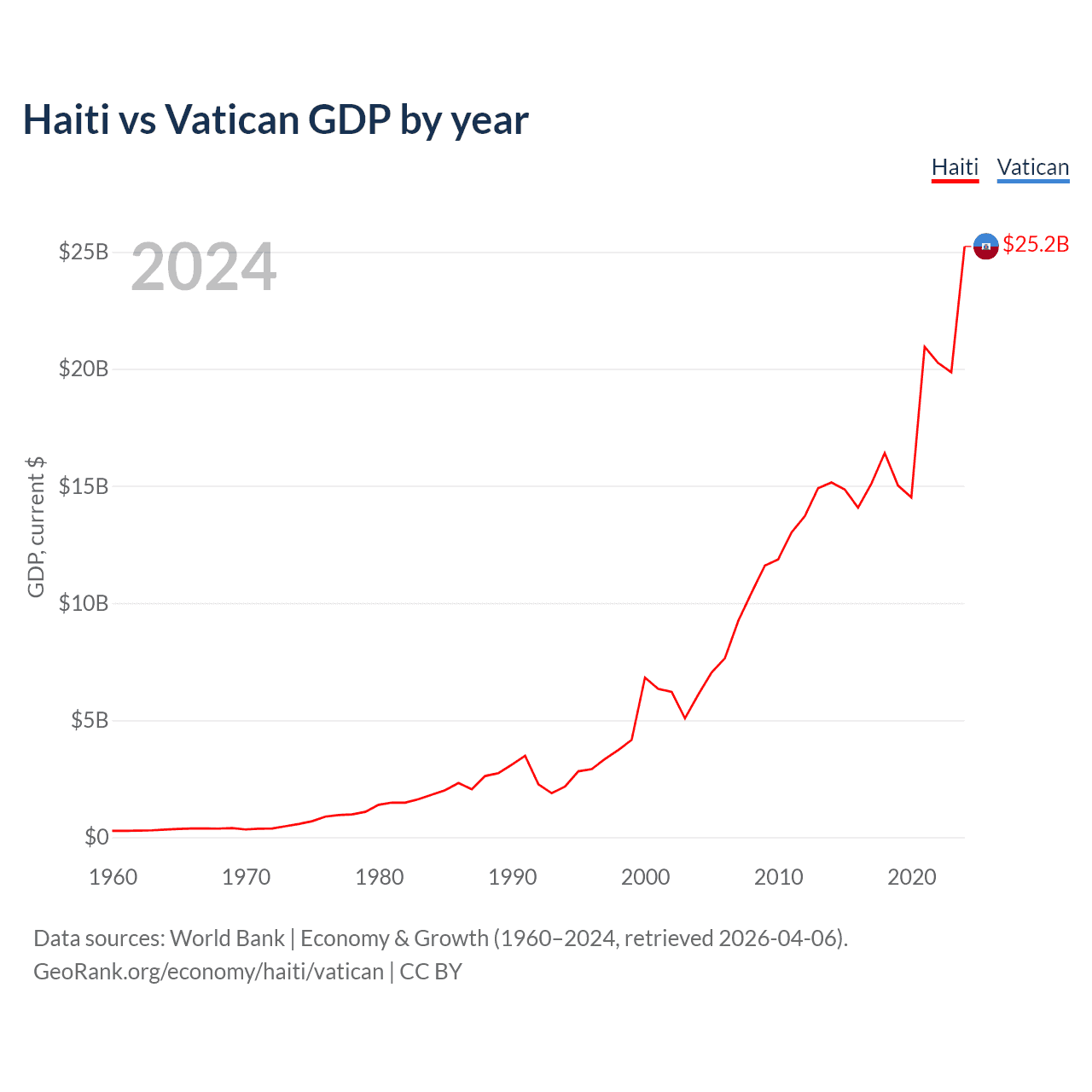 Haiti has a GDP of $25.2B compared to $19.8M for the Vatican, ranking 117/197 and 197/197 by economy size, respectively.