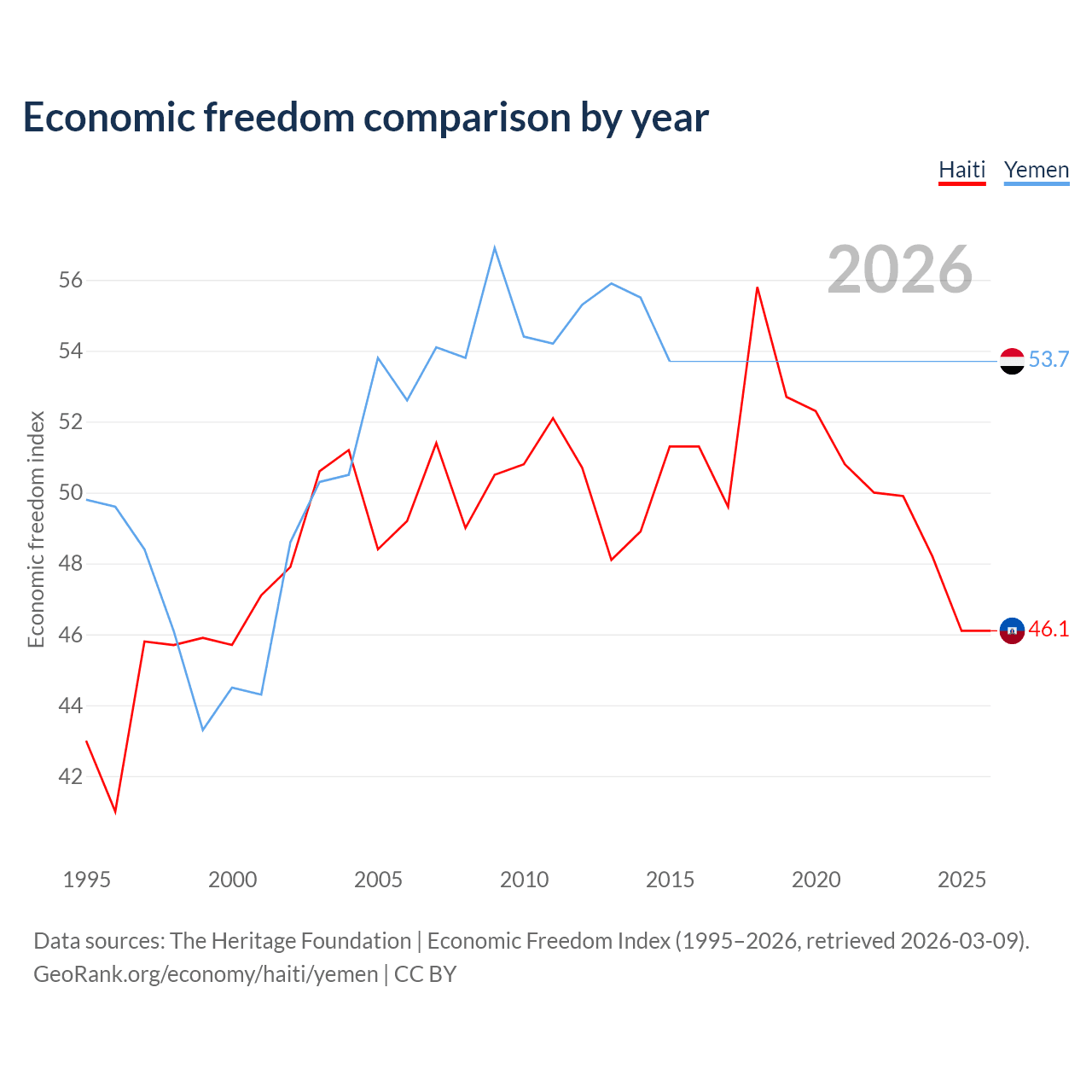 The Economic Freedom Index for Haiti is 46.1, ranking 178/197, compared to 53.7 for Yemen, ranking 138/197. The chart above displays a comparison of annual changes in economic freedom indexes.