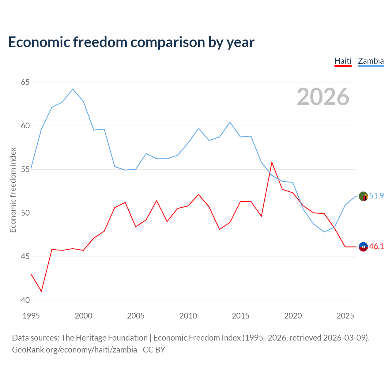 The Economic Freedom Index for Haiti is 46.1, ranking 178/197, compared to 51.9 for Zambia, ranking 152/197. The chart above displays a comparison of annual changes in economic freedom indexes.