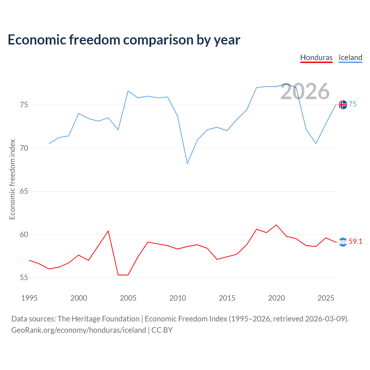 The Economic Freedom Index for Honduras is 59.1, ranking 105/197, compared to 75 for Iceland, ranking 19/197. The chart above displays a comparison of annual changes in economic freedom indexes.