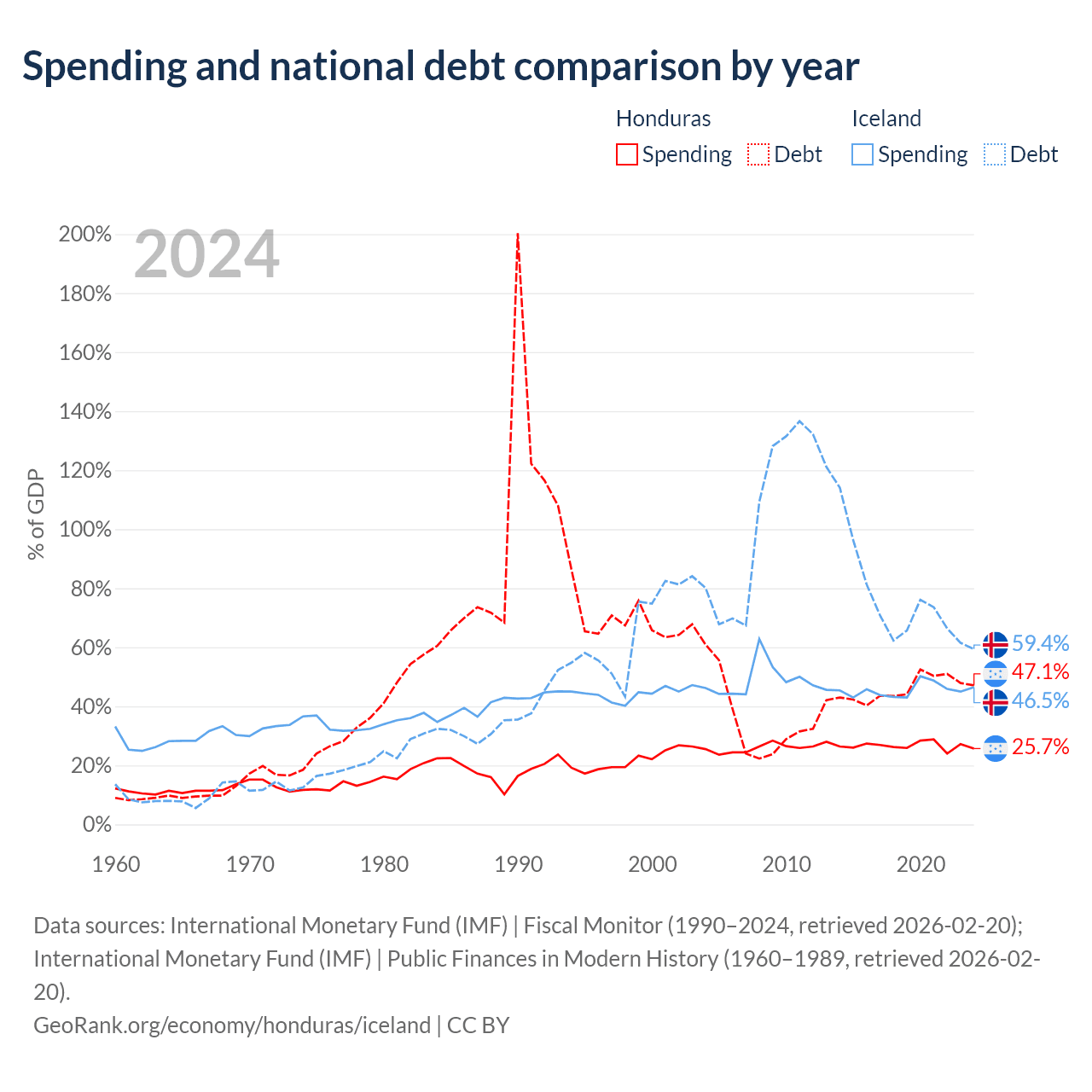 Honduras has $17.5B in government debt (47.1% of GDP), compared to $19.8B (59.4% of GDP) in Iceland.
