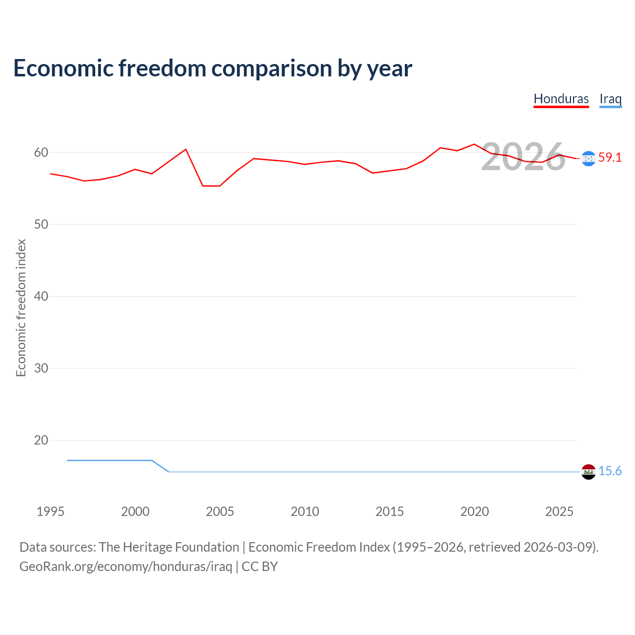 The Economic Freedom Index for Honduras is 59.1, ranking 105/197, compared to 15.6 for Iraq, ranking 196/197. The chart above displays a comparison of annual changes in economic freedom indexes.