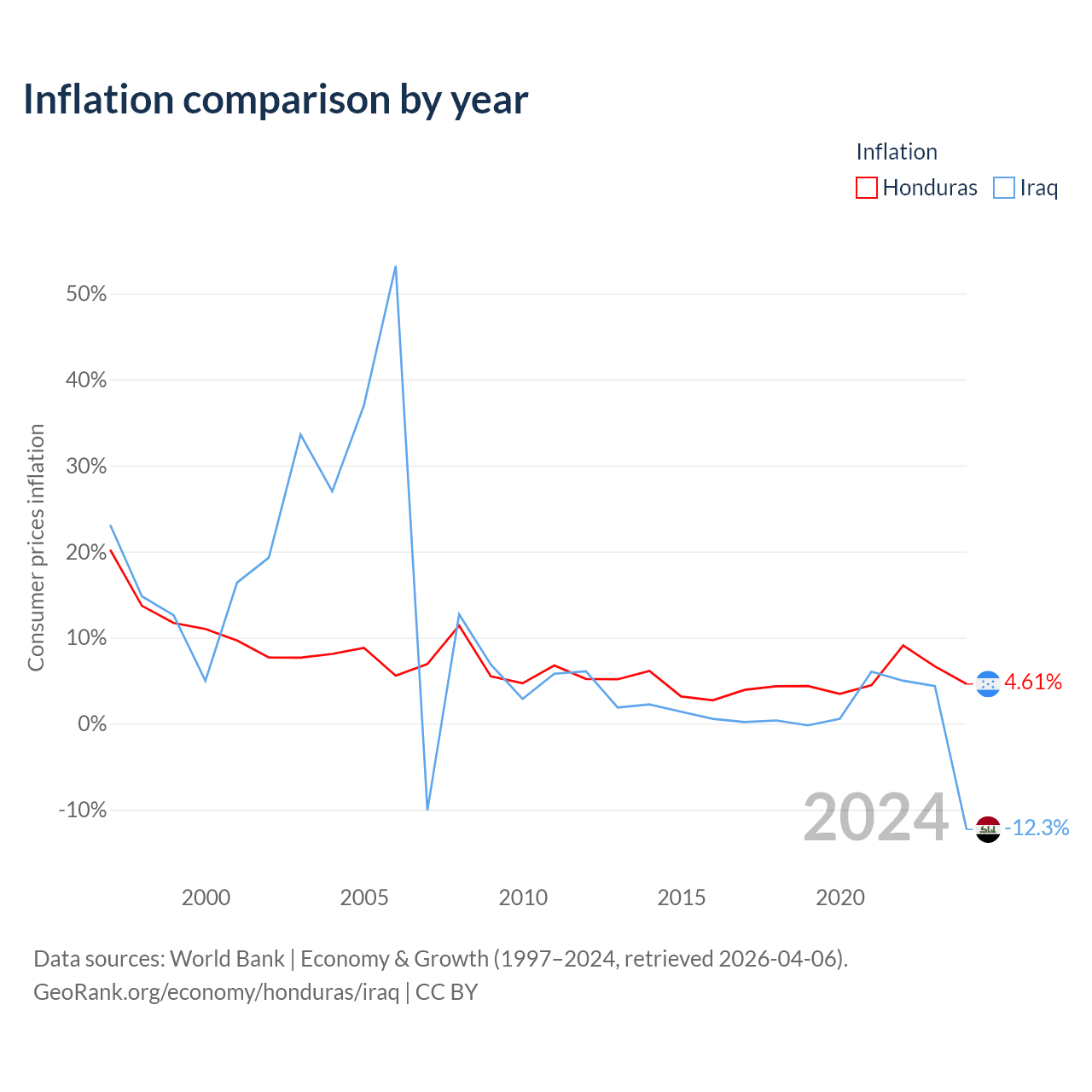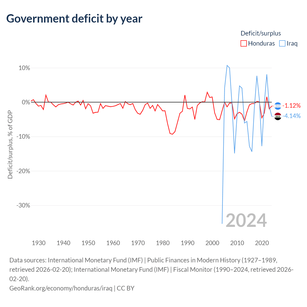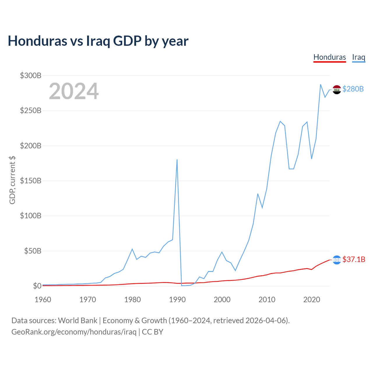 Honduras has a GDP of $37.1B compared to $280B for Iraq, ranking 104/197 and 50/197 by economy size, respectively.