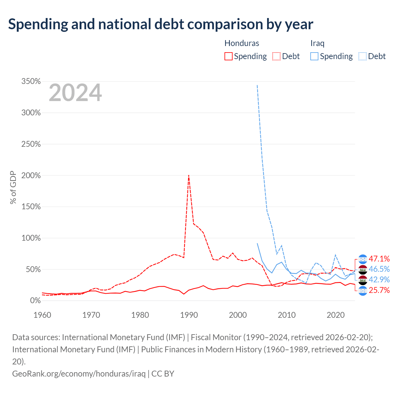 Honduras has $17.5B in government debt (47.1% of GDP), compared to $130B (46.5% of GDP) in Iraq.