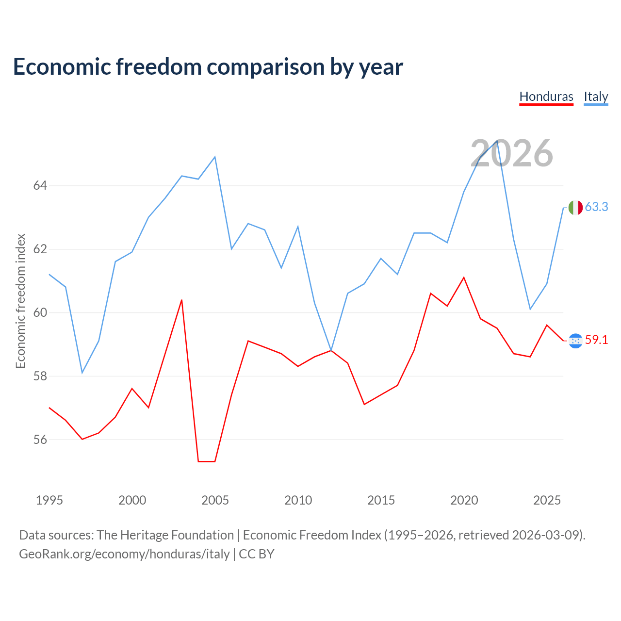 The Economic Freedom Index for Honduras is 59.1, ranking 105/197, compared to 63.3 for Italy, ranking 80/197. The chart above displays a comparison of annual changes in economic freedom indexes.