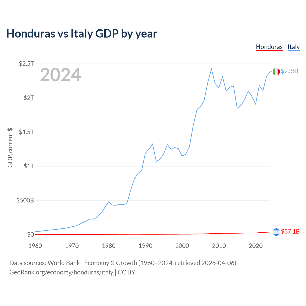 Honduras has a GDP of $37.1B compared to $2.38T for Italy, ranking 104/197 and 8/197 by economy size, respectively.