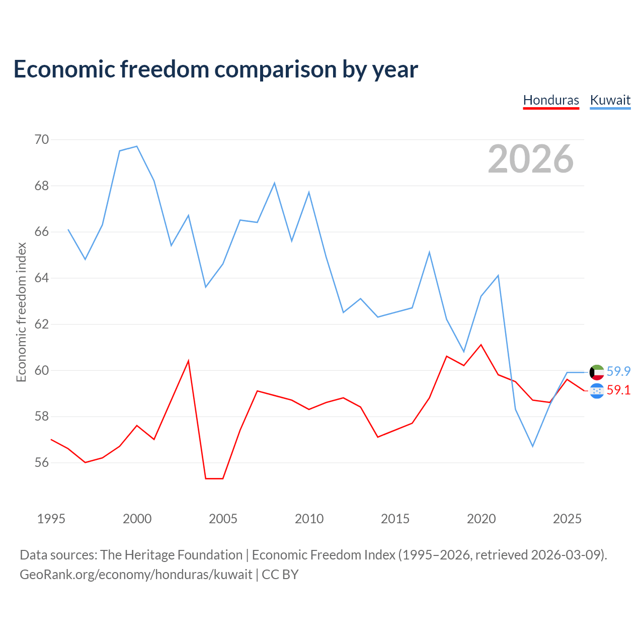 The Economic Freedom Index for Honduras is 59.1, ranking 105/197, compared to 59.9 for Kuwait, ranking 100/197. The chart above displays a comparison of annual changes in economic freedom indexes.