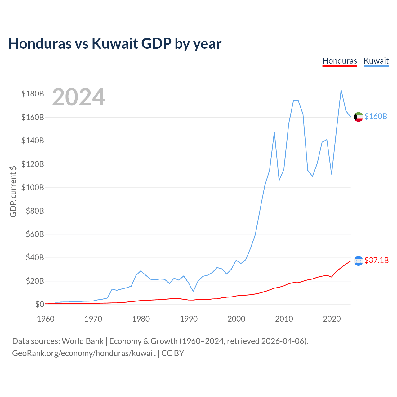 Honduras has a GDP of $37.1B compared to $160B for Kuwait, ranking 104/197 and 59/197 by economy size, respectively.