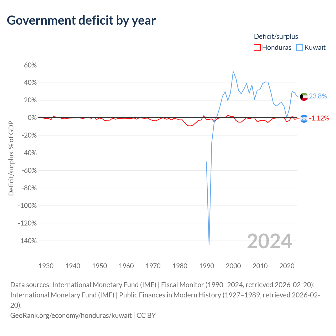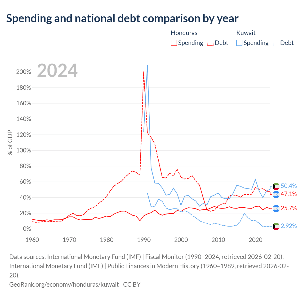 Honduras has $17.5B in government debt (47.1% of GDP), compared to $4.68B (2.92% of GDP) in Kuwait.