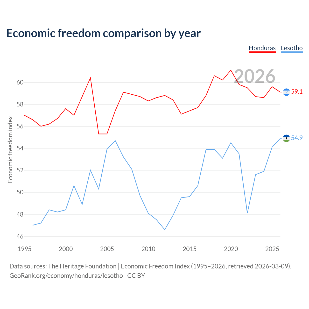 The Economic Freedom Index for Honduras is 59.1, ranking 105/197, compared to 54.9 for Lesotho, ranking 130/197. The chart above displays a comparison of annual changes in economic freedom indexes.